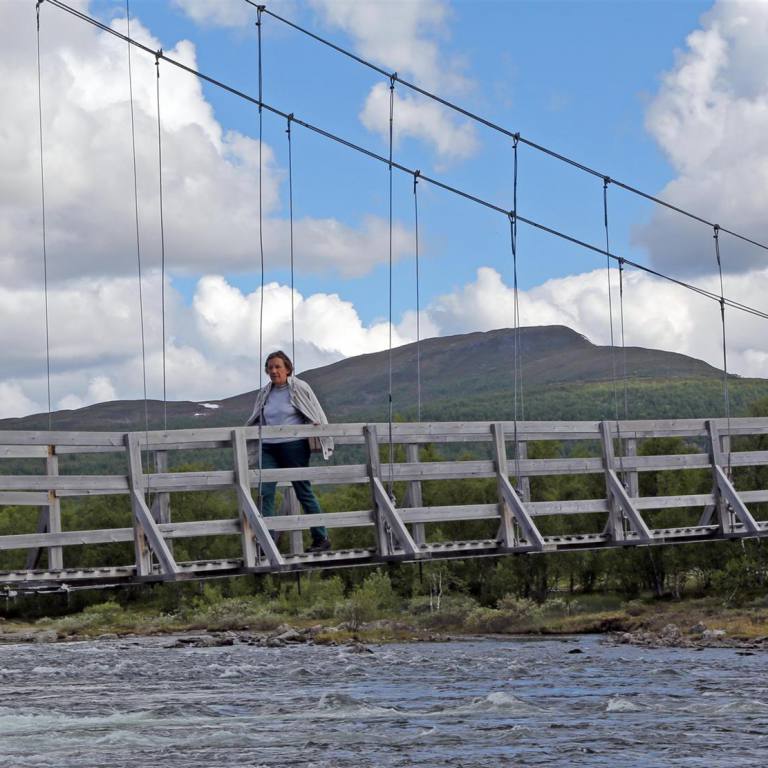 Der Campingplatz von Tärnaby war am Fluss gelegen und etwas ausserhalb der Stadt. Trotzt des Rauschens haben wir gut geschlafen. Nach dem Frühstück bei herrlichem Sonnenschein, gingen wir noch rund eineinhalb Stunden dem Fluss nach aufwärts spazieren. Der Weg war gesäumt von Blumen und verlief hauptsächlich im Wald. Es war erst Frühling in Lappland. Gegen Ende des Weges kam eine Hängebrücke über den Fluss