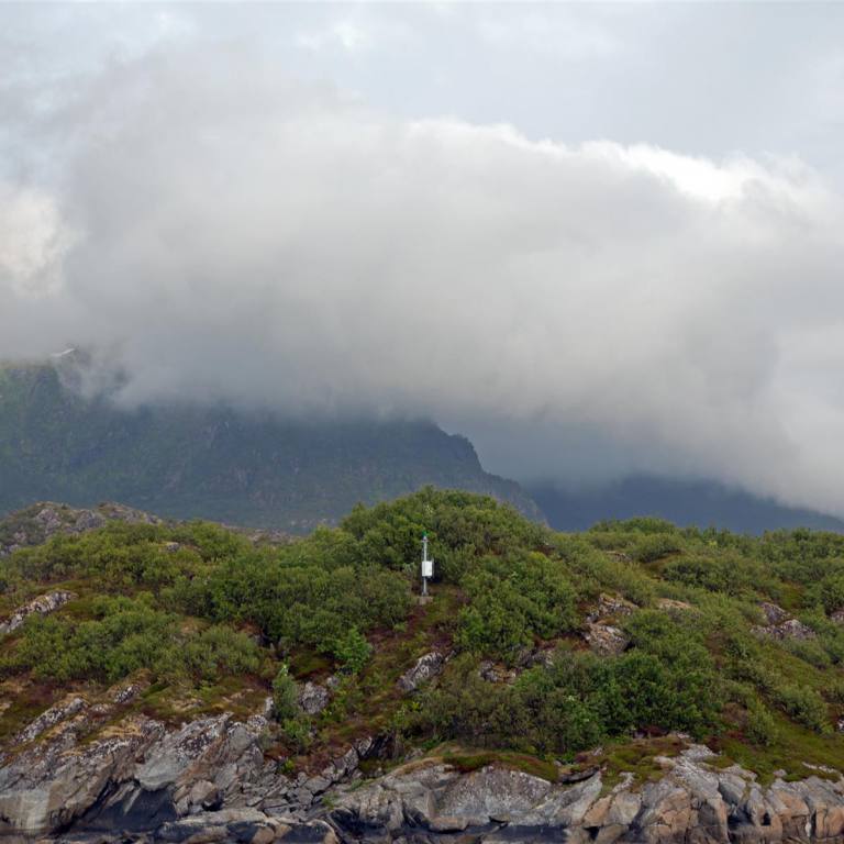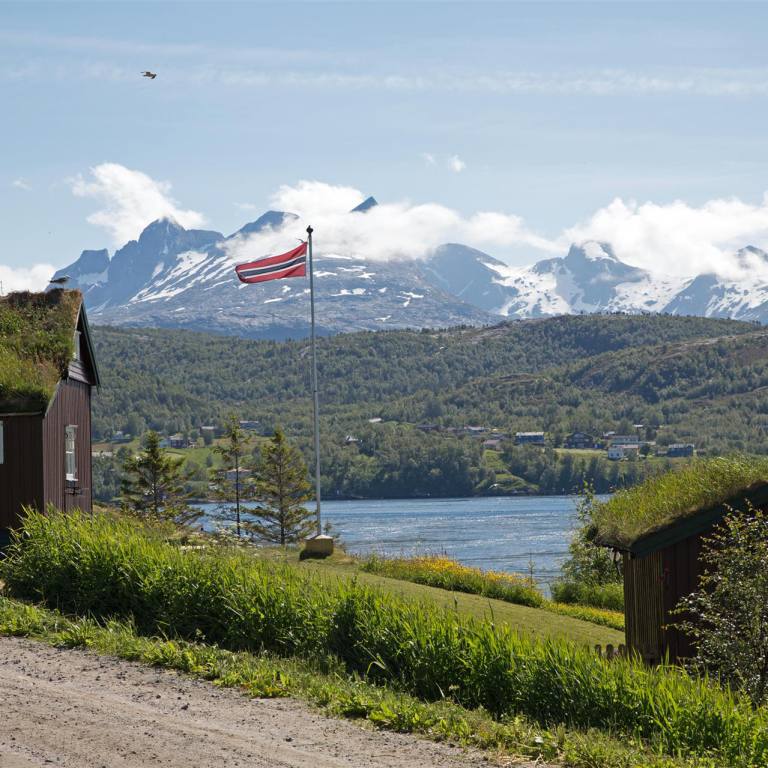 Nachdem es in der Nacht einmal kurz leicht geregnet hat war am Morgen rund herum alles wie mit Nebel verhangen. Wir haben gut geschlafen obwohl die Fähre und die Fischboote in der Nacht 200 m von uns entfernt in den Hafen einliefen. Das Motorengeräusch haben wir nicht mehr gehört. Von Westen her wurde es immer heller und die Wolken verzogen sich. Sehr schnell lichtete sich die Wolkendecke und die Sonne kam heraus. Wir blieben noch in Melbu und spazierten den Hang hinauf wo wir eine wunderbare Rundsicht genossen. Nach einem guten Stück Kuchen und Kaffee fuhren wir gegen Stockmarkes weiter.
