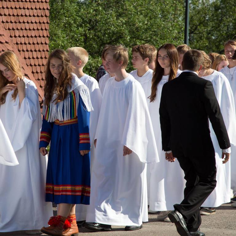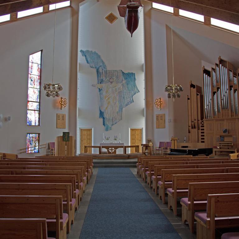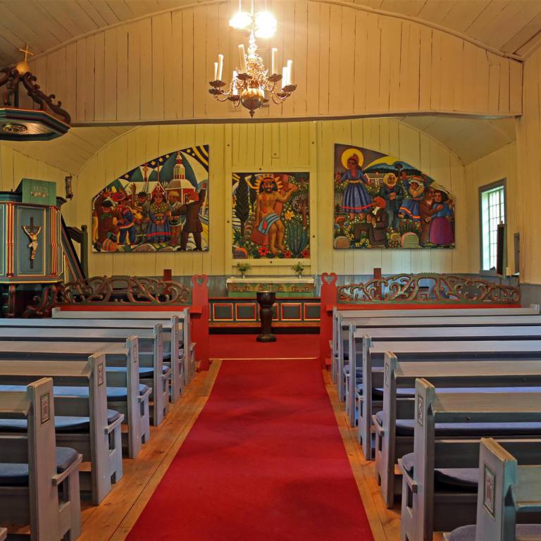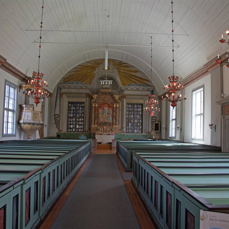 Mit Sonnenschein wurden wir am Morgen aus den Federn gerissen. Am Abend ginge man am liebsten nicht ins Bett, da es seit Tagen eigentlich nie Nacht wird. Nach dem Frühstück zogen wir weiter die E45 entlang gegen Norwegen. Die Strassen sind allesamt gut ausgebaut mit sehr wenig Verkehr. So kann man konstant mit 80 -90 km und Tempomat laufen lassen. Unser Weg führte uns von unserem Campingplatz aus nach Dorothea und Vilhelmina zwei wohlklingende Namen. Aber nur gerade Vilhelmina konnte überzeugen. Wir machten dort einen Spaziergang durch das Städtchen, das einige wunderschöne Häuser hat. In einem kleinen Haus wurden verschiedene Handwerksgegenstände angeboten wovon Tuulia natürlich Gebrauch machte und eine Mütze kaufte. Ein anschliessender Besuch eines Kaffees durfte natürlich nicht fehlen. Es gehörte einer Engländerin, und war speziell eingerichtet. Der Kuchen und das Eis mit Waffel war ein Besuch wert. Ein Spaziergang zur Holzkirche war ein weiterer Höhepunkt des Ortes. Der nächste Halt sollte ca. 70 km weiter sein in Storuman, wo wir von der E45 auf die E12 wechseln, die an die Norwegische Grenze führt. Zuerst aber ging es in die Gegenrichtung und zwar 4 km. Dort eine weitere sehenswerte Holzkirche. Wir parkierten neben der Kirche, kaum ausgestiegen kam eine Frau auf uns zu und fragte ob wir die Kirche anschauen wollen. Eigentlich sei sie seit zwei Stunden geschlossen, aber sie wolle sie uns noch zeigen. Wir haben aufgeatmet, verpassten wir doch schon mal eine wunderschöne Kirche weil sie meistens nur kurze Öffnungszeiten haben. Stensele Kyrka ist die grösste schwedische Kirche aus dem Jahre 1886 erbaut. Sie wird auch Lappland Kathedrale genannt. Die Kirche hat 2‘000 Sitzplätze. Imposant ist die Grösse, wunderschön die Einrichtung. Am Eingang ist eine Art Telefon wo man die Sprache wählen kann. Es wird dann mittels Lautsprechern die an der Decke montiert sind in der entsprechenden Sprache die Geschichte erklärt.
