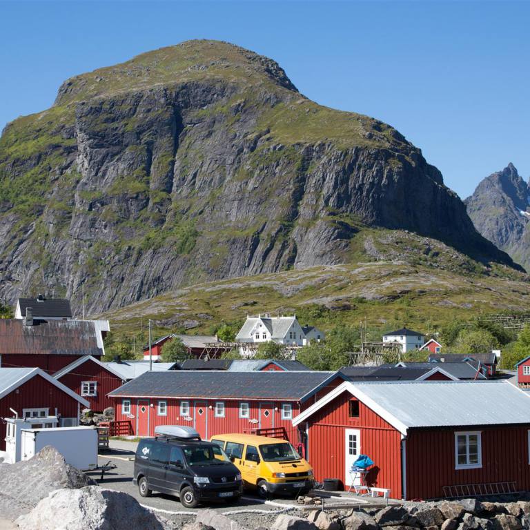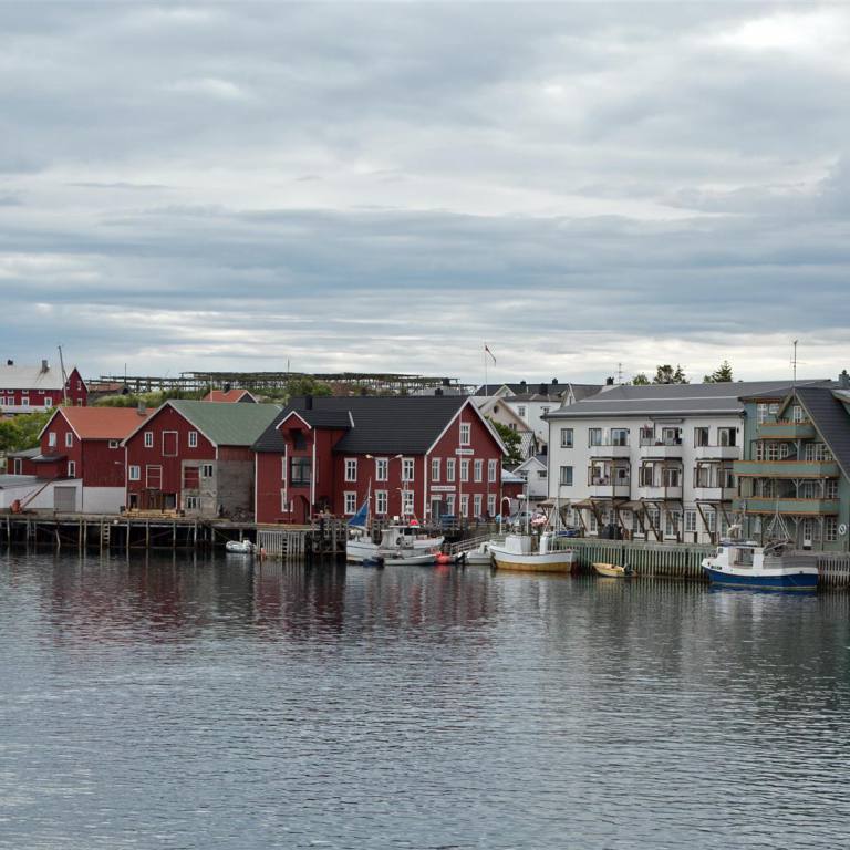 Der Morgen war wieder wunderschön und bereits um 09.00 Uhr warm. Wir fuhren die 9 km wieder zurück auf die E 10. Nach wenigen Kilometern in Borg kam das berühmte Lofotr Wikingermuseum. Wie sich herausstellte war es gut besucht waren doch schon viele Wohnmobile und Autobusse auf dem Parkplatz versammelt. Trotzdem man merkte die vielen Leute nicht da die ganze Ausstellung auf einem grossen Gelände angesiedelt war. Man sieht einen schiffsähnlichen Bau bereits von der Strasse aus. Wenige Meter daneben ist die Wegkirche angesiedelt. 1983 brannte die alte Kirche, darauf wurde eine neue Mehrzweckkirche gebaut. Die Wegkirche hat ca. 10‘000 Besucher im Jahr und soll eine offene Kirche sein. Als Mehrzweckkirche hat sie Räumlichkeiten für eine vielseitige Nutzung. Es sind dies eine Gemeindesaal, ein viel genutztes Kaminzimmer, eine Küche und „man höre“ drei grosse Bombenzimmer im Keller. Auf die Instrumente und den Klang in der Kirche ist die Gemeinde besonders stolz. Die Orgel ist eine Ryde und Berg Orgel mit 18 Register die 1989 fertig wurde. Wegen der hervorragenden Akustik werden viele Konzerte in der Kirch gegeben. Es wurde gar gesagt, dass die Kirche der beste Konzertsaal Norwegens sei. Ein Paar Meter wieder zurück zum Museum und auf dem grossen Parkplatz das Fahrzeug abstellen. Bei der Ticketausgabe wurde man eingeführt in die Technik die man mitbekam. Ohrhörer und eine Stift wie eine Taschenlampe mit Knopf wurden benötigt, damit man die Beschreibungen in den verschiedenen Sprachen hören kann. An jeden Objekt hat es einen Sensor, der mit dem eigenen per Knopfdruck aktiviert wird, dann hört man die interessanten Erklärungen. Dazwischen wird noch ein Film gezeigt über die Wikinger mit Happy End. Wenn man aus dem Gebäude geht und etwas nach oben lauft sieht man ein grosses Schiffsartiges langes Gebäude. Mit 83m Länge ist es der grösste, jemals ausgegrabene und rekonstruierte Häuptlingshof. Im Wohnbereich kann man den Wikingern bei der Arbeit zu schauen. Zu guter letzte macht man noch einen 1.3 km langen Fussmarsch zum Fjord, wo ein rekonstruiertes Wikingerboot steht, mit dem man gemeinsam mit anderen Leute eine Runde rudern darf. Ich habe vom Ufer aus zugeschaut wie lange es dauerte bis die ganzen Ruderer synchron in die gleiche Richtung ruderten. Jedenfalls erreichten sie nach einer halben Stunde wieder den Heimathafen. Unser nächstes Ziel war dann Henningsvaer ein Fischerdorf