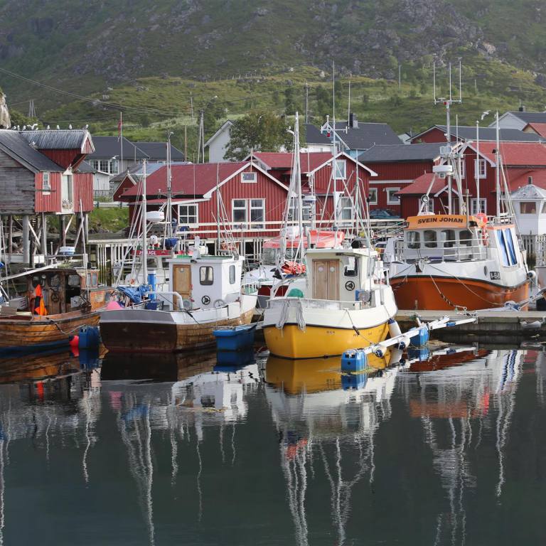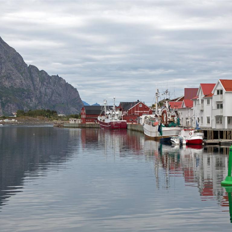 Der Weg zur Stadt, die auf einer Insel liegt führt über zwei grosse Spannbetonbrücken. Es sind eindrückliche Bauobjekte. Das Dorf ähnelt etwas Venedig. Die Häuser sind auf Holzpfählen ins Meer hinaus gebaut. Es gibt viele kleine Geschäfte und Fischbetriebe. Das gab mir das Zeichen in eine Fischbeiz zum Mittagessen zu gehen. Denn frischer bekommt man den Fisch kaum. Und er hielt auch was er versprach. Nach einem weiteren Bummel verliessen wir das Dorf und fuhren die 10 km wieder zurück bis wir die E10 erreichten. Wir wollten nun eigentlich einen gemütlichen Übernachtungsplatz suchen, fanden aber keinen. So fuhren wir um 21.50 Uhr noch mit der Fähre von Fiskebol nach Melbu. Die Fähre ist sehr kurz nur ca. 20 Minuten. Schon bei der Einfahrt sahen wir einige Wohnmobile auf der Molde stehen. Damit war unser Schlafplatz gesichert.