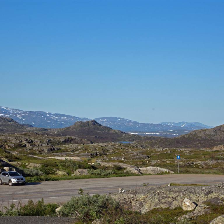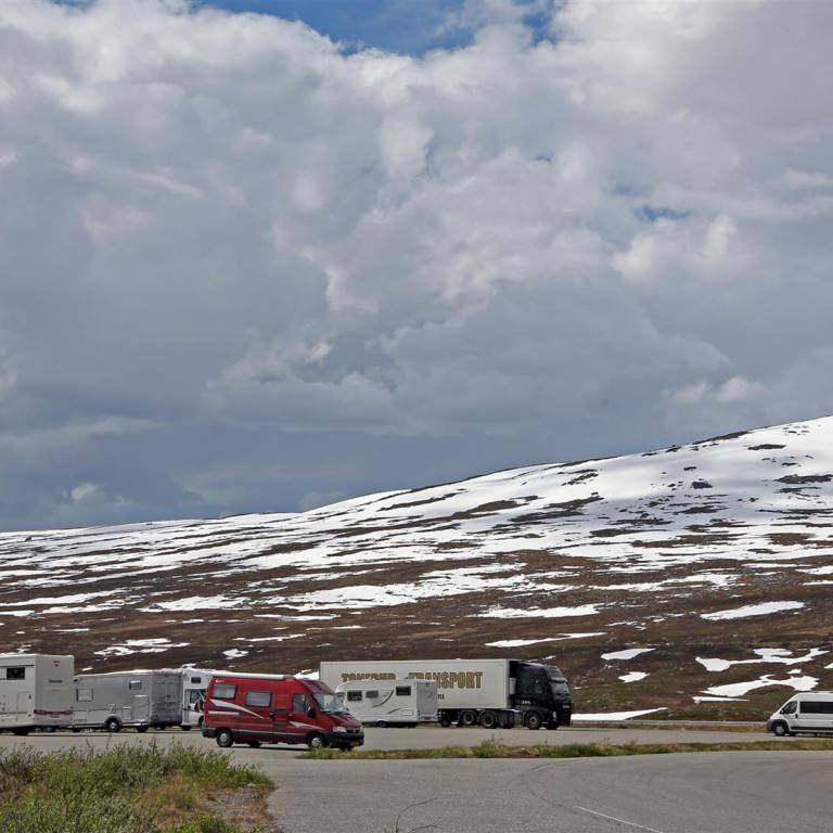 Eine wunderschöne Strecke durch das waldreiche Dunderlandsdalen immer dem Fluss Ranelva entlang. Eigentlich würde man gern am Fluss rasten aber es gibt keine Möglichkeiten. Wir verlassen das Dunderlandstal ziehen in Schleifen bergan, immer noch begleitet uns der Ranelva. Von Kilometer zu Kilometer wandelt er sich vom breitströmenden ruhigen Fluss in einen über Klippen und Felsklötze hinabstürzenden schäumenden und brausenden Strom. Das nächste grosse Ereignis steht uns noch bevor. Wir machen vor der Passstrasse noch kurzen Halt für Kaffee und Kuchen. Wir steigen nun auf knapp 700 m ü Meer. Ist eigentlich nicht viel wenn man an die Schweiz denkt. Hier wird aber schnell ersichtlich, dass die Bäume immer kleiner werden. Es gibt nur noch die kleinen verkrüppelten Birken. Später verschwinden auch diese. Dass im Winter hier oben extreme Bedingungen herrschen sieht man an den hölzernen Garagen die man über die Schienen gebaut hat. In ihnen kann man ganze Züge abstellen, wenn Schneestürme die Weiterfahrt unmöglich machen