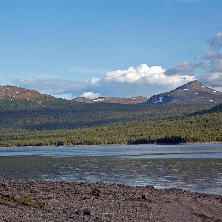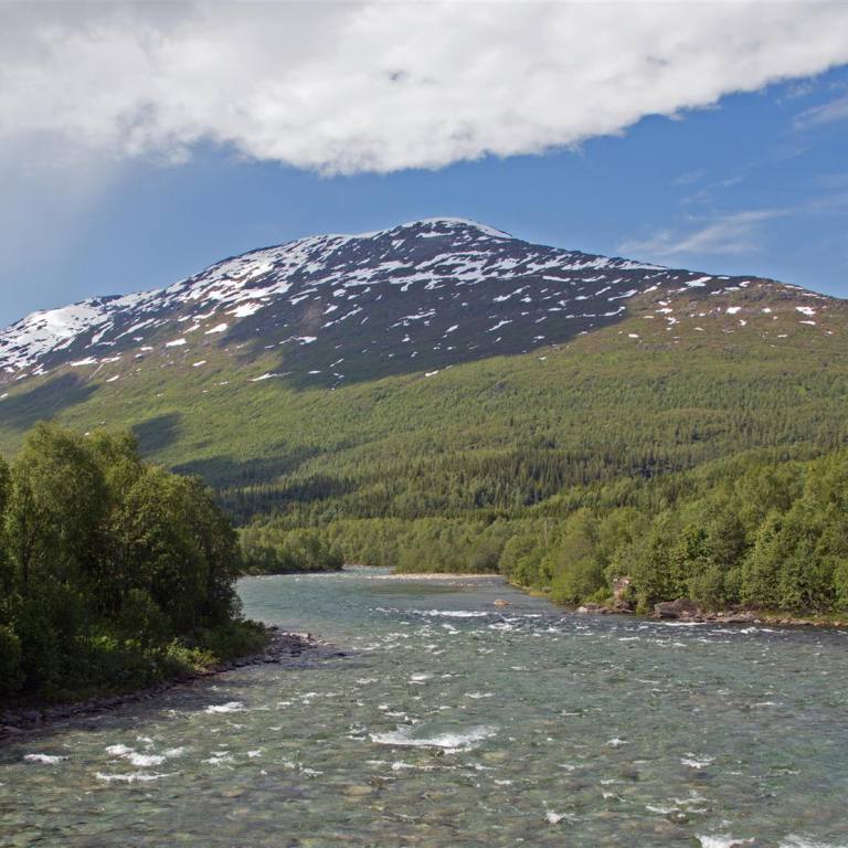 Nachdem wir wieder zurück im Wohnmobil waren, fuhren wir weiter in die Stadt. Es handelt sich um ein Skizentrum. Die ganzen Läden und Lifte waren aber ausser Betrieb oder geschlossen. Also zogen wir weiter nach Hemavan. Dies ist ebenfalls ein Skiort, der aber noch etwas belebter war. In einem Restaurant haben wir den Lunch genommen und sind dann den Berg hinauf gefahren zu einer Sehenswürdigkeit. Das Naturum ist eine erlebnisreiche Ausstellung über die schier unendlichen Weiten des hier angrenzenden Vindelfiäll eines der grössten Naturreservate Europas. Ebenfalls an dieser Stelle ist der Fjällbotanische Garten den nördlichsten der Welt. Im goldenen Turm ist ein anscheinend hervorragend gutes Samisches Restaurant. Leider konnten wir es nicht testen, da es natürlich geschlossen war. Wir mussten demzufolge zu Fuss durch den gut sortierten und markierten Garten zum Orchideensumpf. Aber auch hier war noch nicht viel zusehen. Wir ware rund drei Wochen zu früh vor Ort. Die Blumen waren noch nicht gespriessen, man sah nur die grünen Stengel. Die Aussicht von da oben rundherum auf die Berge und Seen war aber atemberaubend. Wir nahmen den Rückweg über die Skiliftstation zum Wohnmobil. Nun ging es weiter. Ein weiterer kurzer Halt ca. 3 km weiter. Ein Wildwasser unterquerte die Strasse. Blaues lupenreines Wasser kam von den Bergen und floss in den See. Nach weiteren rund 50 Kilometern machten wir nochmals einen kurzen Halt und spazierten rund 2 km über zwei Brücken, Wurzelpfaden und Klein-Birken-Wald dem Ufer des Gausjosjo entlang Richtung Samilager wo verschiedene Spuren von 1000 – 6000 Jahre alter Besiedlung entdeckt wurden. Der weg war uns ab er zu lag, sodass wir vorher umdrehten. Was uns nun erwartete ist unbeschreiblich. Wunderschöne Landschaften mit Seen, Wasserfällen und Bergen begleiten uns auf dem Weg nach Mo i Rama. Die Eindrücke kann man nicht beschreiben. Desshalb lasse ich einige Bilder dafür sprechen. Am Ende ging es rund 500 Meter abwärts auf Meereshöhe nach Mo i Rana.