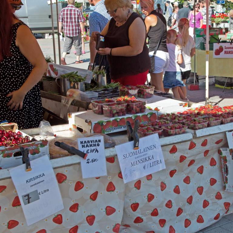 Es scheint heute wieder ein heisser Tag zu werden. Wir standen ziemlich früh auf und benutzen die Kühle den Markt in Kaankanpää zu besuchen. Jeden Donnerstag ist Markt auf dem Hauptplatz. Die ganze Umgebung trifft sich aber auch zu einem Schwatz. Dies kann man in mehreren Freiluftkaffes durchführen. Es gibt natürlich frischen Fisch, wenn gewünscht an Ort geräuchert. Gemüse und Beeren direkt vom Bauern und verschiedene Stände mit Textilien. Es wurde aber sehr heiss, sodass wir nach dem Besuch eines Kaffees schnell wieder ins Ferienhaus zurück fuhren.