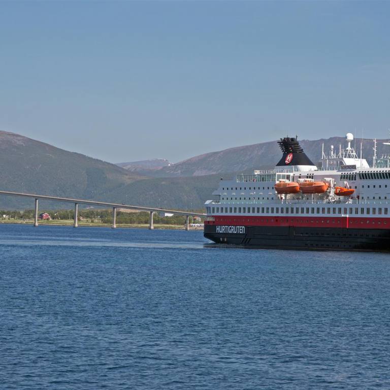 Wir sind nun auf der Västeralen Insel. Nach wenigen Kilometern erreichen wir Stockmarknes. Hier ist übrigens eine der Haltestallen der Hurtigruten. Die Stadt gilt als eine der Gründungstätte der Hurtigruten. Aus diesem Grunde gibt es ein interessantes Museum, wo man aus der Frühzeit der Schiffe Bilder und auch Kabinen und Steuerraum inkl. Navigator besichtigen kann. Im Aussenbereich liegt ein altes Hurtigrutenschiff die MS Finnmarken auf Land, das man anschliessend auch begehen kann. Es ist etwas schade, dass man das Schiff verkümmern lässt ist es doch eine wunderschöne Erinnerung an die alten Zeiten. Während des Schiffbesuches kam gerade die MS Vesterälen zum anlegen und Post- Personen und Güter ein- und auszuladen. Mit diesen schönen Eindrücken fuhren wir weiter und kamen gleich zu nächsten Höhepunkt der heutigen Fahrt die beiden Brücken. Zuerst direkt in Stockmarknes überqueren wir die erste Spannbetonbrücke die hoch hinaus führt. Wenige Kilometer später dann das Bijou der Brückenbauerkunst. Im Hintergrund die bizarre Bergwelt im Vordergrund die grazile Brückenbautechnik. Gestützt auf 26 Pfeiler überspannt sie den Langoysund. Faszinierend in die Höhe zu fahren bis zum höchsten Punkt, dann wieder abwärts. Nächster Halt war Myre. Nach einem kurzen Spaziergang mussten wir feststellen, dass es hier nichts ausser dem Hafen zu besichtigen gab. Also fuhren wir weiter nach Sto. Was nun kam war allerdings absolute Spitze. Wir sind nun, hat man das Gefühl, am Ende der Welt. Eine wunderschöne eigentümliche Landschaft erwartete uns bis wir nach 12 km unseren Nördlichsten Punkt der Reise erreichten. Wirklich am Ende der Strasse war ein kleiner wunderschön gelegener Wohnmobilplatz mit herzigem Restaurant direkt am Meer. Sofort entschieden wir, hier werden wir zwei Tage verweilen und die traumhafte Aussicht auf den Atlantik geniessen. Wir haben die Möglichkeit verschiedene Ausflüge zu machen. Aber zuerst werden wir einmal die Mitternachtssonne Live erleben. Siehe Photos, die nach Mitternacht gemacht wurden.