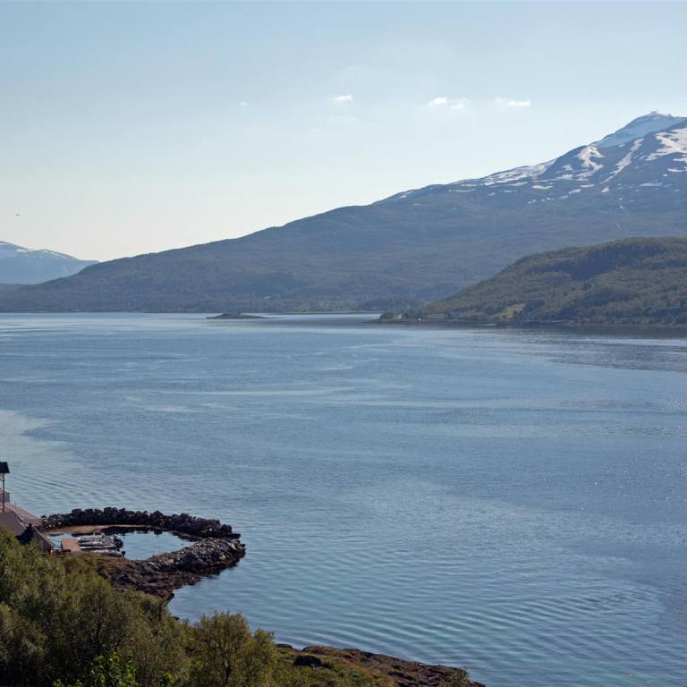 Das Polarkreiszentrum wurde am 13. Juli 1990 gleichzeitig mit der neuen Streckenführung der E 6 über das Saltfjell offiziell eröffnet. Hier befinden Sie sich ca. 680 Meter über dem Meer an der Grenze zum Saltfjellet-Svartisen Nationalpark. Das Saltfjell zeichnet sich durch eine artenreiche Pflanzen- und Tierwelt und zahlreiche Angelseen aus.Das Polarkreiszentrum liegt an der E 6 mitten auf dem Saltfjell im Bezirk Nordland und ist durch diese Lage an der Hauptverkehrsverbindung zwischen Nord und Süd ein natürlicher Halt. Es ist auch wegen seiner der Landschaft angepassten Architektur sehenswert. Im Gebäude und in der Umgebung ist der Polarkreis deutlich gekennzeichnet. Wir haben Postkarten geschrieben und sind noch rund eine Stunde in der Umgebung spaziert. Es ist landschaftlich ein breites Tal mit Schneebergen rund herum. Keine Bäume aber immer noch Schneeflecken. Im Wohnmobil haben wir dann Mittag gegessen und sind am späten Nachmittag langsam gegen Rognan weiter gefahren. Die E6 führt uns entlang des Saltasalva weiter hinab ins Saltdal. Die schneebedeckten Gipfel links über uns gehören noch immer zu 1800 Quadratkilometer grossen Nationalpark Saltfjell. Auch hier immer wieder schöne Blicke zum tossenden Fluss der über Terrassen ins Tal zieht. Wir nähern uns Rognan am Meer. Die letzten Kilometer sind flach nachdem es zügig von 700 m auf ging. Wir erreichten die Stadt wo wie einen schönen Platz mit direkter Sicht auf das Meer und die untergehende Sonne geniessen.