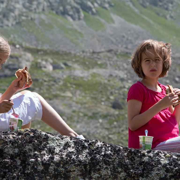 Nach einer knappen Stunde hiess es anziehen und den Weg zurück unter die Füsse nehmen. Es ging aber nicht mehr den langen Weg zurück. Wir stiegen einige Höhenmeter hinunter und stellten fest, dass es unten auch noch einen Stellplatz für Wohnmobile gab. Auf der Ebene mussten wir noch mehr als ein Kilometer unter der warmen Sonne laufen ehe dann St. Moritz Bad kam wo wir dann das Postauto bestiegen. Ein langer Tag neigte sich dem Ende entgegen. Als wir zu Abend essen wollte, kam nochmals Elfriede zu Besuch und kurz darauf kam auch ein Gewitter, das aber harmlos verlief. Die Abkühlung tat aber gut. Die Kinder gingen gegen neun Uhr gerne ins Bett, womit auch schnell Ruhe im Mobil eintrat.