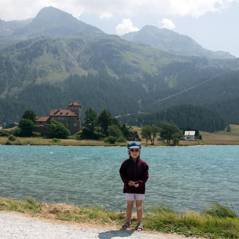 Irgendwie zog der Weg ins Unendliche. Wir liefen dem Silsersee entlang Richtung St. Moritz. Am Ende des Silsersees und nach mehrmaligen Fragen von Passanten konnte uns niemand eine Richtige Antwort geben. Also liefen wir nun Bergauf. Der Weg war ziemlich Steil und die Kinder liefen und liefen ohne Murren und Fragen. Das Ziel war klar. Der Badesee der Geheimtyp von Elfride. Aber er wollte auch nach Stunden nicht kommen. Am Scheitelpunkt fragten wir eine Frau, die uns das erste Mal glaubhaft den Weg wies. Aber es ging weiter aufwärts. Als wir am Verzweifeln waren kam wie aus dem Nichts der See. Wir haben nicht mehr daran geglaubt. Ich wäre umgekehrt aber Finja bewog uns weiter zu laufen. So kamen die Kinder dann doch noch zu ihrem Bad. Teuer verdient !