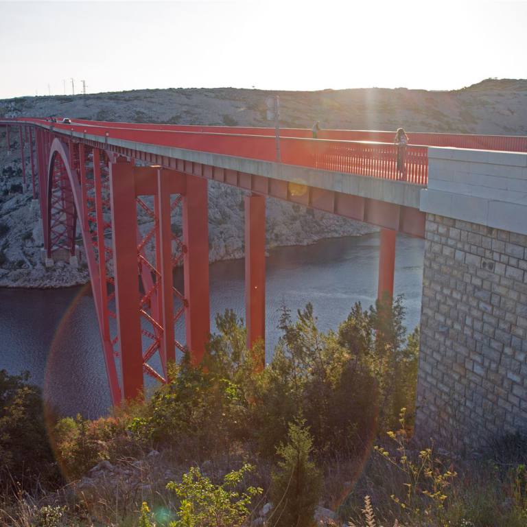 Als wir am Morgen die Jalousien hochzogen staunten wir nicht schlecht. Es hatte ganz feinen Seenebel. Dieser begleitete uns dann noch einige Zeit während der Fahrt. Die Sonne drückte zwar immer wieder durch, konnte sich aber noch nicht durchsetzen. Bei einem kleinen Halt für eine Kaffee Pause zogen wir ein Knöllchen ein. Wir haben auf dem Busparkplatz rasch parkiert und hatten prompt alle einen Straffzettel am Scheibenwischer. Gegenüber war der Polzeiposten den wir sofort aufsuchten. Der stämmige Polizist wollte aber nichts wissen. Er verwies uns auf die Post. Wir lassen es mal drauf ankommen. Die Fahrt ging weiter der Küstenstrasse entlang. Sie schlängelte sich von Bucht zu Bucht. Dabei konnten wir atemberauschende Aussichten, von der Strasse die sich etwas am Berghang entlang schlängelte, sehen. Kurz vor Rjeka zweigt die Strasse Richtung der Insel KRK ab. Es kommt eine Zahlstelle für die imposante Brücke auf die Insel.