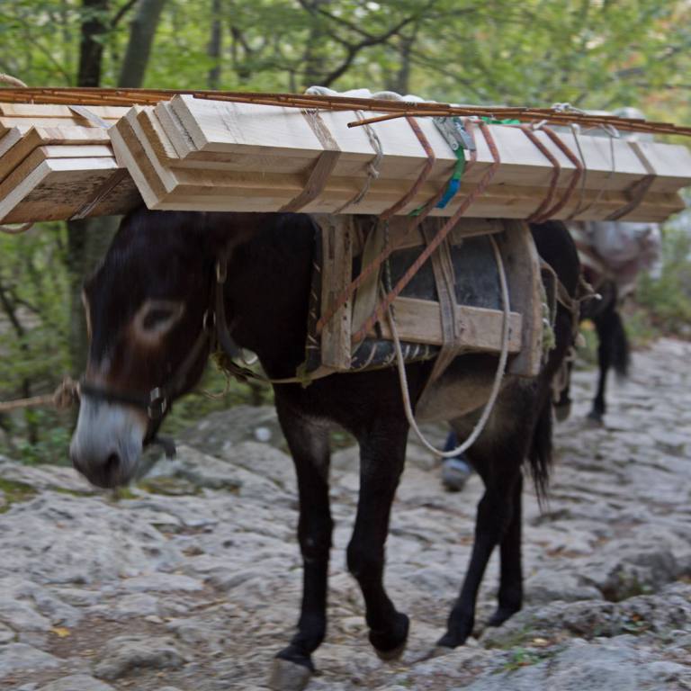 Auf dem Weg nach oben kam uns ein Train entgegen. Zwei Esel beförderten Baumaterial über den holprigen, schwer zu laufenden Weg. Einer hatte gar ein Armierungsnetz geschultert.