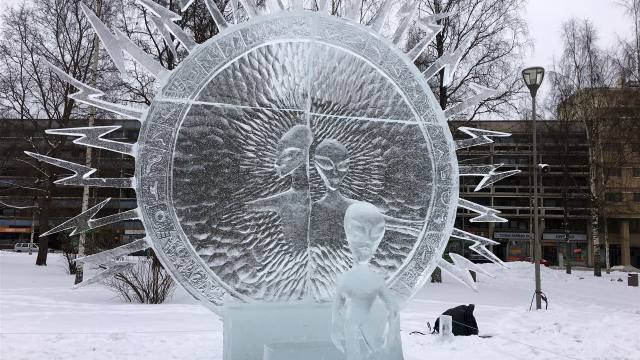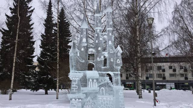 Ein weiterer grauer Tag beginnt. Es ist weiter kalt und es schneit ganz leicht. Heute wollen wir nach Mikkeli um kleine Möbel für uns zu suchen. Erkkis Frau hat uns die Stadt empfohlen, da es dort kleine Möbelhäuser gibt. Nach etwas mehr als einer Stunde ( 80 km) trafen wir in Mikkeli ein. Da es bereits Mittag waren gingen fuhren wir in die Stadtmitte um etwas zu Essen. Im Stadpark waren gerade die Siegerehrungen der Eisplastiken im Gange. Wir schauten kurz die Wunderwerke an.