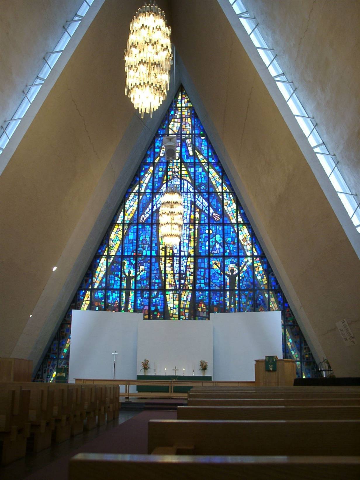 Die Kirche ist ganz aus Beton gebaut und außen mit Titanplatten verkleidet. Die Altarwand wurde mit einer blauen Lasur behandelt, um die davor stehende Christusfigur besser zur Geltung zu bringen. Auch das Innere der Kirche ist aus Beton, alle Holzdetails, Stühle und der Fußboden sind aus massiver Eiche. Die Innenwände der Kirche wurden mit insgesamt 800 Metern vertikalen Leisten verkleidet, die durch Leuchtdioden beleuchtet sind. Dadurch entsteht ein warmes und sanftes Licht. Somit tragen die Leisten gleichermaßen zu einer angenehmen Atmosphäre und zu einer guten Akustik bei.
