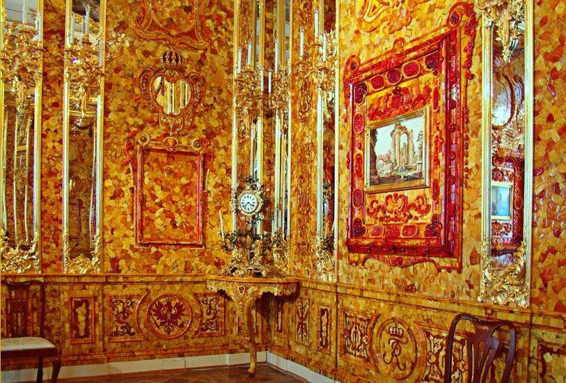 Berühmt ist der Palast auch durch das überwältigende Bernsteinzimmer. Der funkelnde Saal ist über 100m2 groß und über und über mit Bernstein verkleidet. Im Zweiten Weltkrieg wurde der komplette Wandschmuck verschleppt, doch die Restaurateure haben in mühevoller Kleinarbeit das Puzzle aus 500.000 Bernsteinteilen nach alten Fotografien wieder zusammengesetzt. Heute wird es auch als „Achtes Weltwunder“ bezeichnet. Man darf im Zimmer nicht fotografieren. Desshalb habe ich mir erlaubt ein Bild zu stehlen.