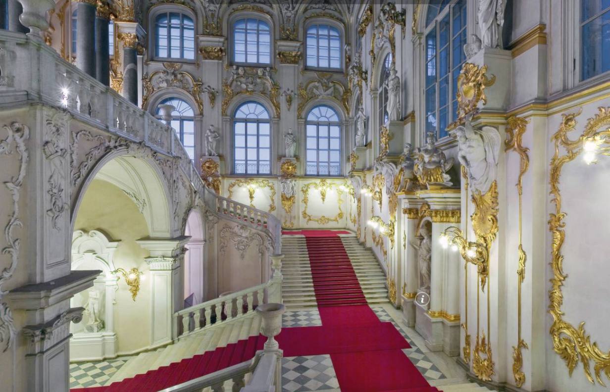 Es hatte viele Gruppen beim Eingang. Irina entschloss sich einen anderen Eingang zu nehmen. So kamen wir schnell in den Komplex. Wir stiegen direkt in die erste Etage. Dazu benutzen wir aber eine Seitentreppe. Die Haupttreppe ist pompös geschmückt und besteht aus Marmor, Granit und Gold.