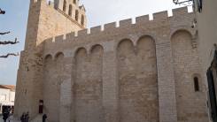 Da wir relativ früh in Nyons waren benutzten wir die Gelegenheit zu einem kurzen Spaziergang. Nyons hat ein imposantes Altstadtviertel, das auf das 13. und 14. Jahrhundert zurückgeht. Aus dem 15. Jahrhundert stammt der zentrale Place du Docteur Bourdongle. Wir spazierten in den schmucken Gassen und genehmigten uns trotz später Stunde einen Kaffee. Nachher ging es den Berg hinauf zum Tour Randonne der bereits Ende des 13. Jahrhunderts erbaut wurde; damals diente er als Wehrturm (donjon) und Gefängnis. Um die Mitte des 19. Jahrhunderts wurde er in eine Kapelle (Notre-Dame de Bon-Secours) umgewandelt und erhielt seinen pyramidalen mehrgeschossigen Giebelaufsatz mit einer 3,50 m großen Marienfigur auf der Spitze.