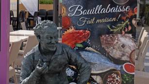 Nach rund zwei Stunden machten wir uns auf den Weg ans Mittelmeer. Die ersten 40 km aus Nyons heraus war geprägt durch eine nie endende Ebene mit Weinbergen und Olivenhainen, einen großen Teil der Fläche wird als AOC klassifiziert zusammensetzt. Am Rande des Eygues sind Obstplantagen ebenfalls anwesend: Aprikose, Pflaume, Kirsche ... Der Olivenbaum ist ein integraler Bestandteil des kulturellen Erbes Nyons. Schleie ist die einzige Sorte von Oliven, die auf dem Boden und Klima der Region Nyon angepasst hat. Die Oliven werden reif gepflückt so schwarz, zwischen Dezember und Januar. Oliven und Olivenöl wurden im Jahr 1994 die AOC erhalten. Wir fuhren an bekannten Wein Schlössern vorbei. Im Rhône-Tal werden zu über 90 % Rotweinreben von außerordentlicher Qualität angebaut, die bedeutendste Rebsorte ist Syrah. Im Gegensatz zu den meist schweren Weinen aus dem Norden, werden im Süden auch leichtere Rotweine hergestellt. Die Appellationen des zweitgrößten AOC-Anbaugebiet Frankreichs sind zahlreich, darunter gehören unter anderem Côte Rôtie und Hermitage im Norden sowie Châteauneuf-du-Pape und Côtes du Lubéron im Süden. Dazu gehören auch die Kreisel, die zu hunderten am Weg lagen und teilweise sehr schön gestaltet sind. Als Beispiel sei der untenstehende Kreisel gezeigt, der kurz nach Nyons auf dem Weg lag.