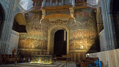 Im Gegensatz zum festungsartigen Äußeren der Kathedrale ist das Innere künstlerisch reich ausgestaltet. Italienische Künstler gestalteten die Fresken im Innenraum im Stil der Frührenaissance. Das Fresko im Gewölbe ist mit einer Länge von 97 m und einer Breite von 28 m das größte Werk der italienischen Renaissance in Frankreich. Es wurde von 1509 bis 1512 durch Künstler aus Modena und Bologna gestaltet. Ein Gemälde an der Westwand des Kirchenschiffes stellt das Jüngste Gericht dar. Von einem unbekannten franko-flämischen Maler zwischen 1474 und 1484 gemalt, ist es eines der bedeutendsten Kunstwerke des späten Mittelalters. Die Orgel wurde zwischen 1734 und 1736 von Christophe Moucherel mit 43 Registern auf vier Manualen erbaut und verfügt heute über 55 Register auf 5 Manualen und Pedal. Besonders bekannt ist ihr Prospekt, mit 9 Rundtürmen der größte historische Prospekt weltweit. Gleichwohl gilt das Instrument als eine der größten und bedeutendsten französischen Barockorgeln. Der ursprüngliche Klangcharakter wurde 1977 -81 wieder hergestellt.