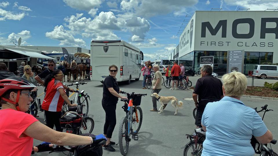 Am Abend eröffneten die drei Geschäftsführer die Veranstaltung. Mit vielen interessanten Informationen wurde die Morelo Familie informiert über das Geschehen in den letzten Monaten. Es sind nun gegen 600 Fahrzeuge angereist aus Schweden, Norwegen, Finnland, Polen, Lettland, England, Frankreich usw. Der nächste Tag verspricht verschiedene Aktivitäten an denen man teilnehmen kann. Für die gemütlichen eine Kutschenfahrt mit Sekt durch das Steigenberger Land. Eine Velotour ebenfalls in der näheren Umgebung, Technikrunde mit Reinhard Löhner, verschiedene Aussteller vor allem Lieferanten von Morelo und viele Essensstände mit feinem Essen und Wein. Bier darf in der Gegend natürlich auch nicht fehlen, hat sie doch die meisten Bierbrauereien in Deutschland. Nicht vergessen darf man die Betriebsführungen, wo ich um 15.20 Uhr einen Termin habe. Zuerst ging es aber mit rund 50 Gleichgesinnten auf Velotour.