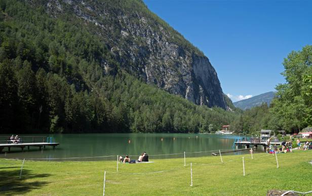 Wegen der Tiefenwasserableitung ist das Wasser des Tristacher Sees kristallklar und von bester Qualität. Im Sommer erreicht es badefreundliche Temperaturen bis zu 24 Grad. Zum See gehört ein bestens ausgestattetes Strandbad. Zwar findet man hier unter Bäumen schattige Plätzchen, aber Sonnenschirme sind auch sehr nützlich. Unsere Rettung war das gemütliche Strandbad-Terrassencafé. Der Aufstieg hat Durst gegeben, Zwei gute Gösserbiere retteten uns das Leben. Um den Tristacher See verläuft ein romantischer Rundwanderweg.