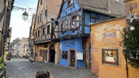 Anschliessend ging es weiter nach Riquewihr. Das Städtchen mit seinen Fachwerkhäusern aus dem 13. bis 18. Jahrhundert ist ebenfalls wunderschön. Riquewihr – so stellt man sich einen malerischen Ort in den Weinbergen vor: romantische Gassen, historisches Kopfsteinpflaster und schöne Fachwerkhäuser. Umgeben wird Riquewihr aber nicht nur von Weinreben, sondern auch von einer mittelalterlichen Mauer. Im Ortskern gibt es mit unzähligen Restaurants und Weinkellern viele gute Gründe zum Schlemmen und Genießen! Wir genossen die wunderschönen Häuser und machten einen Halt in einem Kaffee. Tuulia genoss eine Tasse Kaffee mit einem Gebäck. Wir nahmen den Anlass zu einem Aperitiv was in den Weindörfern auch ausgeschenkt wird. Wir genossen den guten Weisswein. Nach vielen weiteren Schritten ging es in ein urtypisches Restaurant. Unsere Reise war aber noch nicht beendet.