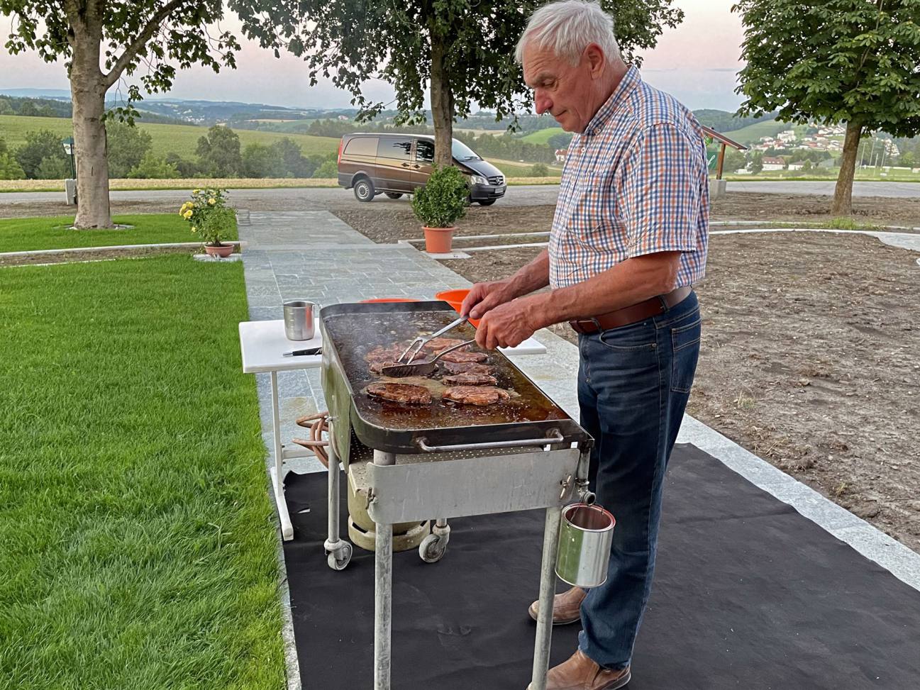 Nach den Spielen ging es wieder bergauf. Mit dem E-Velo kein Problem. Heute wollte der Platzchef grillieren. Gegen 50 Personen freuten sich auf einen gemütlichen Abend. Wir wurden überrascht von einem Salat- und Dessert Buffet. Der Seniorchef bediente den Grill. Es gab diverse Wildstücke von der eigenen Jagd. Das habe ich noch nie gehabt. Schmeckt fein. gegen 22.00 Uhr löste sich die Gesellschaft langsam auf. Wir genossen noch den Sonnenuntergang und gingen später Schlafen. Morgen ist ein weiterer strenger Tag. Morgen spielen zu den anderen Mannschaften auch noch die drei U21 Teams in zwei Spielen um den EM Titel.