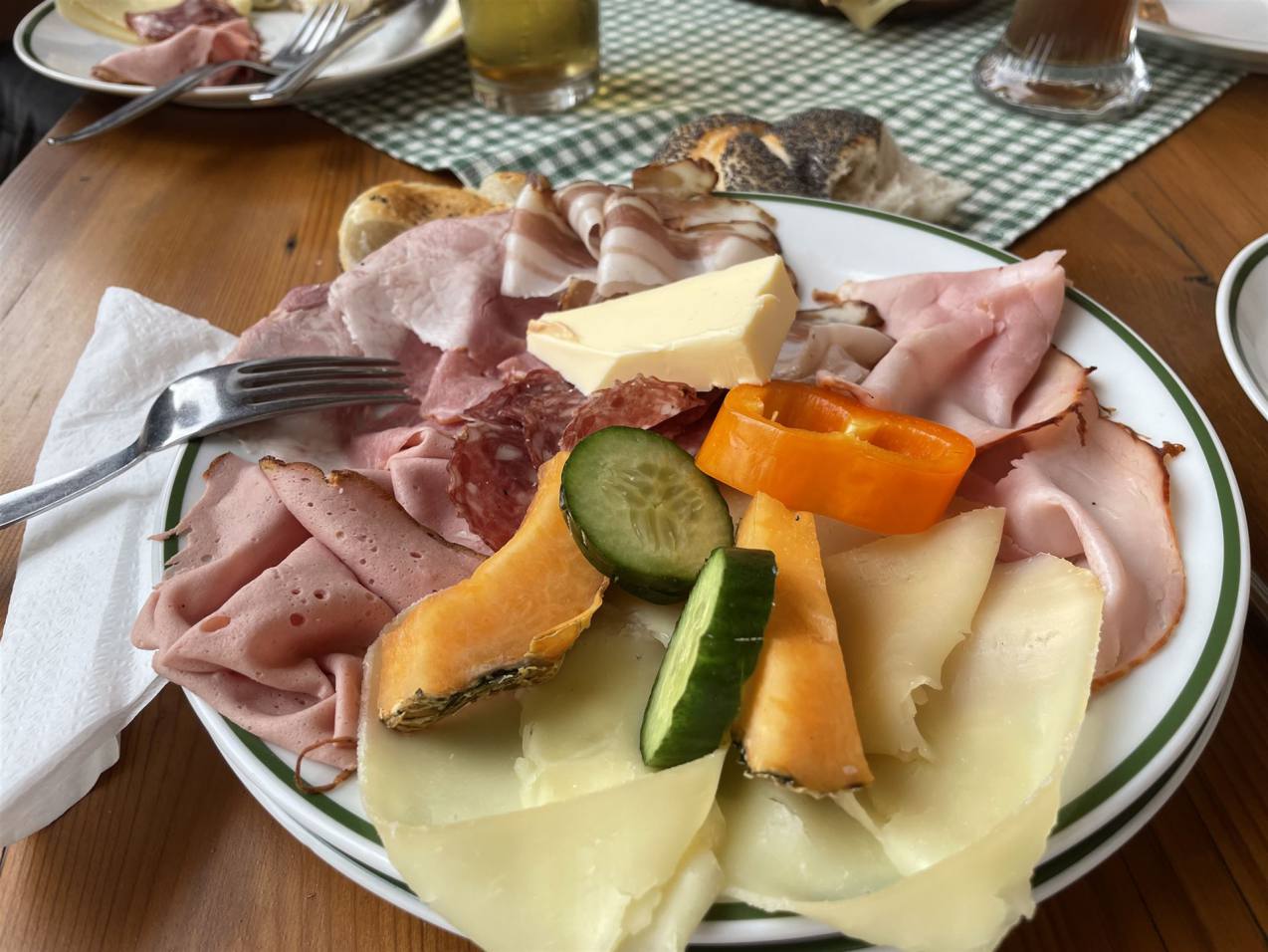 Der Platzbesitzer hat eine Schweinezucht auf dem Hoch und gleichzeitig einen Stellplatz für Camper. Die Chefin macht die Küche und so ist es richtig heimelig hier. Wir verabredeten mit ihr zu einer Jausseplatte um 19.00 Uhr. Herrlich Fleisch direkt vom Hof war perfekt. Gegen 22.00 Uhr verkrochen wir uns in die Wohnmobile.