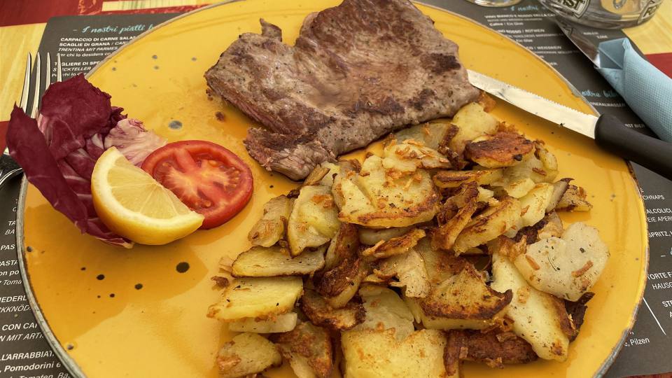 Ein weiterer blauer Himmel erwartet uns am Morgen. Nach dem Frühstück mit frischen Brötchen trennten sich die Frauen von den Männern. Die Frauen bereiteten sich vor um nach Bozen zum Shoppen zu fahren, Nelly informierte sich wann der Bus nach Eppan fährt. Rechtzeitig waren sie an der Haltestelle, es kam kein Bus. Nach Rückfrage an der Rezeption stellte sich heraus, dass der Fahrplan erst nächste Woche gilt. Freundlicherweise wurden sie dann vom Campingplatz Betreiber mit dem Auto befördert. Nach weiteren Instruktionen für den Rückweg konnten sie dann nach fünf Minuten den Bus nach Bozen nehmen. Rolf und ich sind auf dem Platz geblieben. Ich habe um 13.00 Uhr eine geschäftliche Teems Sitzung. Rolf hat mir Gesellschaft geleistet. Nach einem kurzen Aufstieg mit der Drohne haben wir uns dann dem Aperitiv gewidmet. Die Zeit verging schnell bei interessanten Gesprächen.