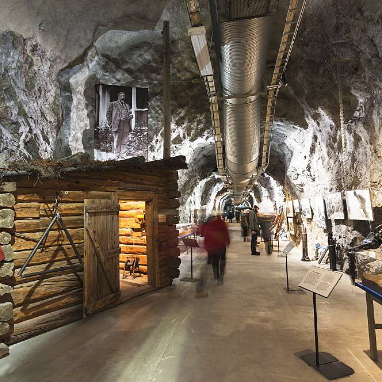Gegen Mittag erreichte ich bereits die Erz Stadt. Ich parkte bei der Sporthalle wo es einen grossen Parkplatz gibt. Zuerst gab es Mittagessen. Ich machte mir selber etwas. Um 14.00 Uhr hatte ich mich für die Tour ins Erzbergwerk angemeldet. Ich konnte von meinen Parkplatz in wenigen Minuten zum Touristbüro fahren von wo aus der Bus uns abholte. Ich war erstaunt waren doch rund 60 Personen bereit zum einsteigen. Pünktlich ging es los. Nach 15 Minuten tauchten wir in den Berg ein auf einer breiten unbeleuchteten Strasse. Rund 15 Min ging es bergab auf - 500 m. Die Bergspitze trägt die Bezeichnung 0 m, der Schachtkopf der Aufzuganlage befindet sich auf dem Niveau −142 m, der Eingang zur Grube auf dem Niveau −230 m. Mit den Jahren wurde der Abstand zwischen den Hauptsohlen immer größer. Die Hauptsohlen des Bergwerks befinden sich bei −275 m, −320 m, −420 m, −540 m, −775 m, −1045 m und −1365.