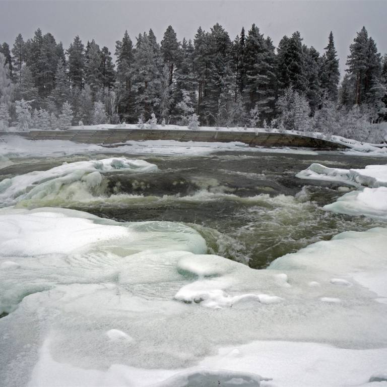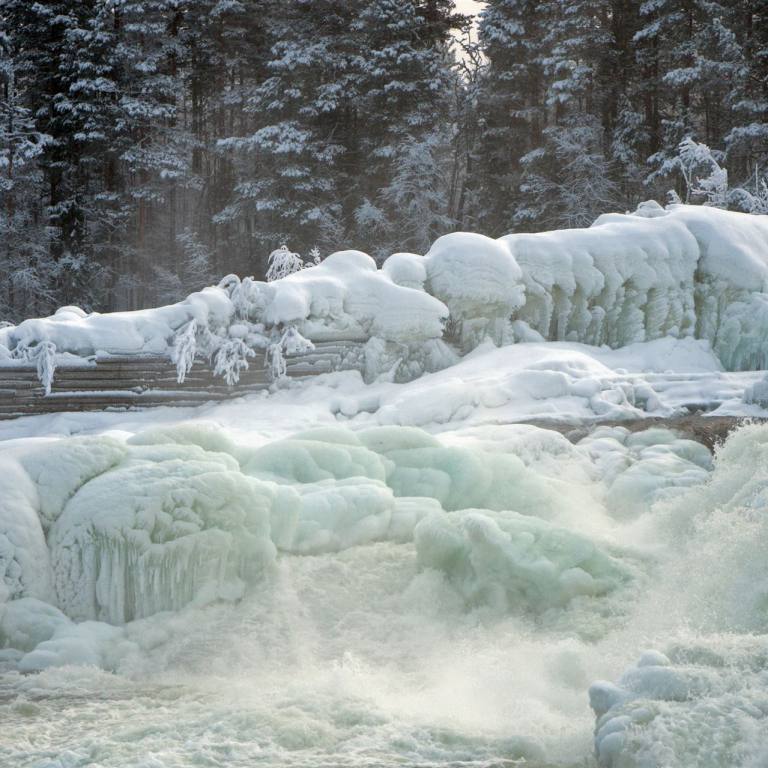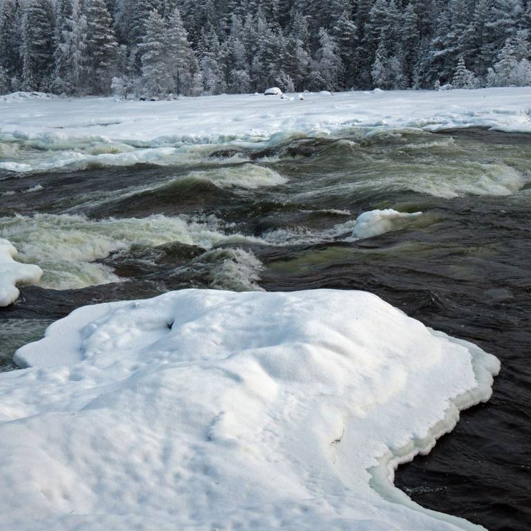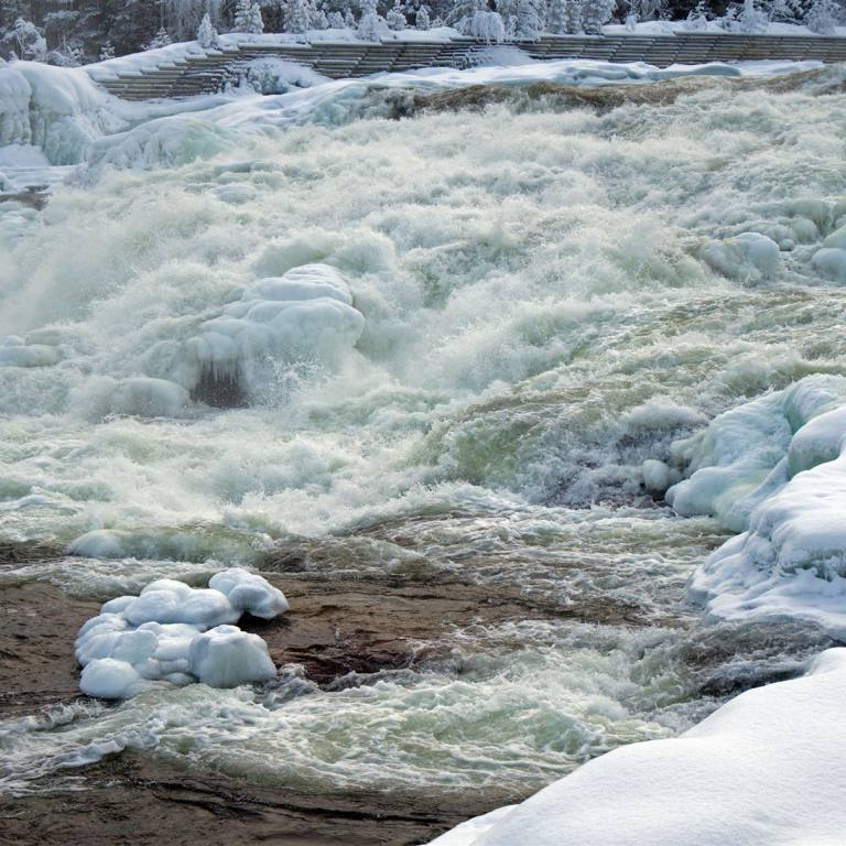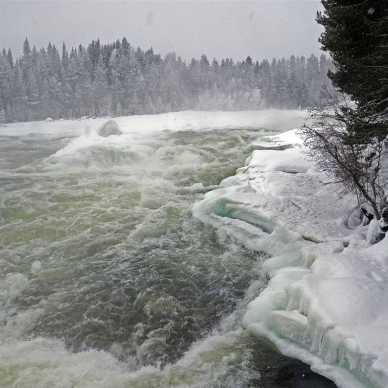 Storforsen ist der Name großer Stromschnellen am Piteälven in der in Nordschweden. Sie liegen etwa 38 km nordwestlich des Ortes Älvsbyn. Bei einer Fallhöhe von 60 Metern wälzen sich durchschnittlich 250 m³ Wasser pro Sekunde talwärts, was sie zu den größten Stromschnellen Skandinaviens macht. Die Gesamtlänge der Stromschnellen von Anfang bis Ende beträgt 5 km, wobei sie dabei eine Höhendifferenz von 82 m überwinden. Während der Mittsommerwochen ist das Wasserniveau am höchsten, wobei dann ca. 870 m³ Wasser pro Sekunde ins Tal fließen. Leider war es grau in grau und bereits sehr düster. Die Farben kamen desshalb etwas schlecht rüber. Der Piteälven ist 400 km lang und mündet bei Piteä in den Bottnischen Meerbusen. Es ist beindruckend wie die Wassermassen sich durch das Eis schlängeln. Am Ende schichten sich Eismassen übereinander. Es ergibt eine echte Schneise