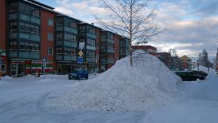 Nach einer halben Stunde ging es weiter. Ohne Halt machte ich die restlichen Kilometer bis Skelleftea. Eingangs der Stadt gibt es wie überall in Schweden grosse Einkaufsgeschäfte. Ich sah einen COOP aber Schwedisch der ein Restaurant hatte. Also suchte ich das Lokal im Coop und genoss das Mittagbuffet um 14.00 Uhr. Ich hatte mir einen Stellplatz in der Stadt ausgesucht. Er liegt auf der anderen Seite des zugefrorenen Flusses und ist auf dem Camp der Universität von Skelleftea. Hier hat es top Moderne Zimmer, Mensa und Hörsäle. Der Campus ist auf einer grossen Fläche angesiedelt. Umeå liegt die Innenstadt ungefähr auf der Höhe des Flussufers, in Skellefteå rund zehn Meter darüber. Und wie toll man diesen Niveauunterschied in Skellefteå genutzt hat! Hier haben Landschaftsarchitekten ganze Arbeit geleistet und eine wunderschön terrassierte Anlage entworfen – mit Park, Restaurants, Cafés, Skulpturen, Beachvolleyballfeldern, Kinderspielplatz und vor allem ganz vielen Sitzgelegenheiten und Sonnenliegen. Die Stadt ist sehr Modern gebaut. Ich hatte die Gelegenheit um 16.00 Uhr noch einen Spaziergang zu machen leider bereits bei Dunkelheit.