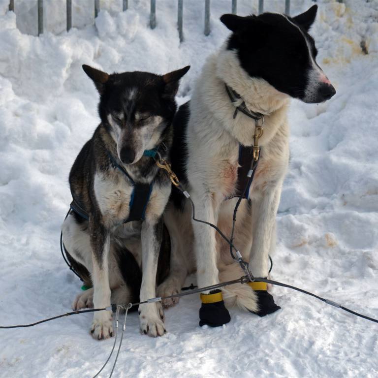 Heute war der grosse Tag. Nach dem Frühstück wurden wir mit warmen Sachen eingekleidet. Dann instruierte Nadja uns über das Mushern. Nach einer halbstündigen Einweisung durften wir zu den Gespannen gehen, die bereits bereit standen und sehnsüchtig auf das Laufen freuten was man unhörbar sah.