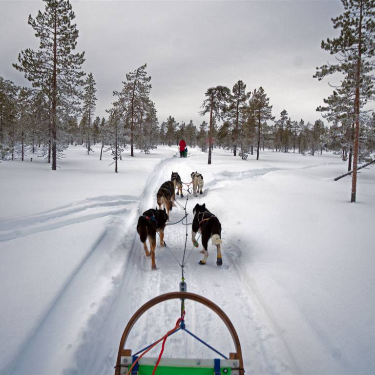Es braucht eine Weile bis alle Hunde bereit sind. Die einen brauchen noch Schuhe wegen dem agressiven Schnee alle Gespanne müssen vorbereitet werden zum Starten. Das ist ein ziemlich schwieriges Prozedere weil sie alle wie wild heulen und drängen damit es endlich los geht. Dann ist es soweit. Einer nach dem anderen startet. Nun will jeder schneller sein als der andere. Man muss auf der Bremse stehen bis sie sich angewöhnt haben und wach sind. Dann geht es durch wunderschöne Gegenden, durch Wälder über Seen und unendliche baumlose Flächen. Wir haben Glück gehabt. Es ist bissig Kalt - 17°C aber es weht kein Wind. Unsere dicken Kleider und Schuhe sind aber hervorragend und man kommt nicht zum Frieren.