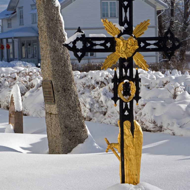 Unterwegs gibt es viele zugefrorene Seen. An einem habe ich eine schöne Kirche mit traumhafter Umgebung gesehen und kurz angehalten. Der Friedhof ist voll zugeschneit und man sieht nur noch einzelne Grabsteine.