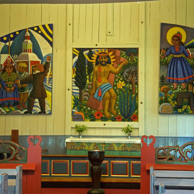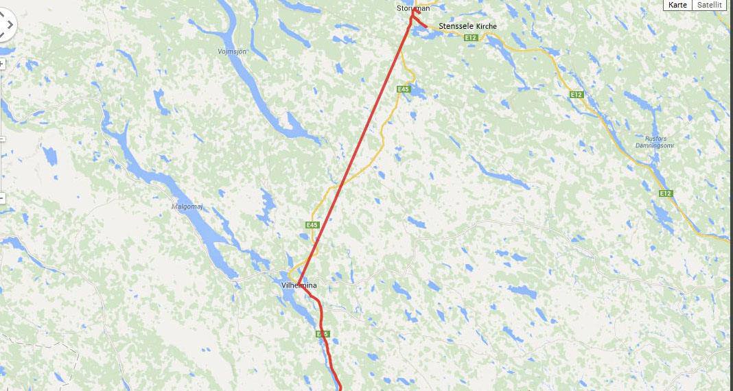 Mit Sonnenschein wurden wir am Morgen aus den Federn gerissen. Am Abend ginge man am liebsten nicht ins Bett, da es seit Tagen eigentlich nie Nacht wird. Nach dem Frühstück zogen wir weiter die E45 entlang gegen Norwegen. Die Strassen sind allesamt gut ausgebaut mit sehr wenig Verkehr. So kann man konstant mit 80 -90 km und Tempomat laufen lassen. Unser Weg führte uns von unserem Campingplatz aus nach Dorothea und Vilhelmina zwei wohlklingende Namen. Aber nur gerade Vilhelmina konnte überzeugen. Wir machten dort einen Spaziergang durch das Städtchen, das einige wunderschöne Häuser hat. In einem kleinen Haus wurden verschiedene Handwerksgegenstände angeboten wovon Tuulia natürlich Gebrauch machte und eine Mütze kaufte. Ein anschliessender Besuch eines Kaffees durfte natürlich nicht fehlen. Es gehörte einer Engländerin, und war speziell eingerichtet. Der Kuchen und das Eis mit Waffel war ein Besuch wert. Ein Spaziergang zur Holzkirche war ein weiterer Höhepunkt des Ortes. Der nächste Halt sollte ca. 70 km weiter sein in Storuman, wo wir von der E45 auf die E12 wechseln, die an die Norwegische Grenze führt. Zuerst aber ging es in die Gegenrichtung und zwar 4 km. Dort eine weitere sehenswerte Holzkirche. Wir parkierten neben der Kirche, kaum ausgestiegen kam eine Frau auf uns zu und fragte ob wir die Kirche anschauen wollen. Eigentlich sei sie seit zwei Stunden geschlossen, aber sie wolle sie uns noch zeigen. Wir haben aufgeatmet, verpassten wir doch schon mal eine wunderschöne Kirche weil sie meistens nur kurze Öffnungszeiten haben. Stensele Kyrka ist die grösste schwedische Kirche aus dem Jahre 1886 erbaut. Sie wird auch Lappland Kathedrale genannt. Die Kirche hat 2‘000 Sitzplätze. Imposant ist die Grösse, wunderschön die Einrichtung. Am Eingang ist eine Art Telefon wo man die Sprache wählen kann. Es wird dann mittels Lautsprechern die an der Decke montiert sind in der entsprechenden Sprache die Geschichte erklärt.