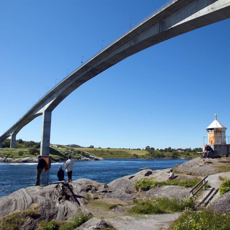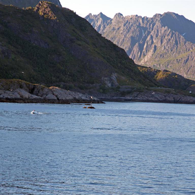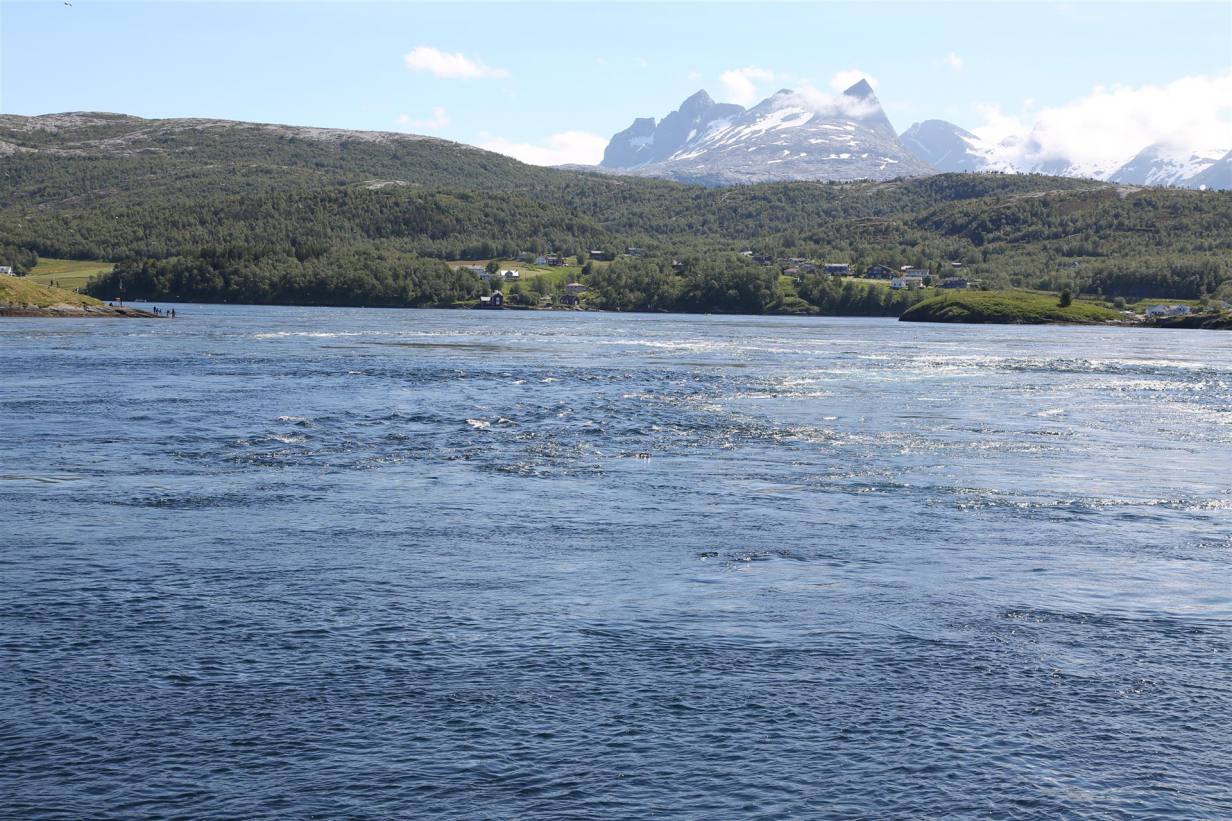 Ein schöner Tag erwartete uns. Heute geht’s auf die Lofoten. Der Tag begann unter idealen Bedingungen. Die Sonne schien aus einem wolkenlosen Himmel und die Temperaturen waren angenehm warm. Die Aussicht famos. Wir hatten einen Fjord vor uns mit glasklarem grünlich-blauen Wasser. Wir fuhren rund 60 km dem Fjord entlang, wobei die Strecke in den Fels rein gebaut ist. Es kommen auch immer wieder kürzere und längere Tunnels. Ein Strecke bei der man aufpassen musste vor lauter schauen nicht neben die Bahn zu kommen. Das Ziel vor Bodö waren noch die Saltstraumen. Rund 25 km vor Bodö drehten wir links ab und fuhren 12 km bis zu einer Verengung des Fjordes. Es ist ein Gezeitenstrom. Bei Ebbe und Flut strömt das Meerwasser wild strömend und gewaltige Strudel bildend durch die Meerenge. Es ist schon faszinierend wenn fast 400 Mio m3 Wasser sich im laufe der 6 Stunden durch die 3 km lange und 150 m Breite Meeresenge drängen. Der Strom erreichte ein Geschwindigkeit von 20 Knoten. Die Strudel haben einen Durchmesser von bis zu 10 m. Vier mal am Tag etwa alle sechs Stunden ändert der Strom den Gezeiten folgend seine Richtung und liegt dann kurze Zeit still da, bevor die Wassermassen mit voller Kraft in die andere Richtung fliessen. Das Wasser führt auch Nahrung für grosse Fischschwärme mit sich, und diese locken Meeresvögel und Fischer an. Ein Naturereignis dem man stundenlang zuschauen kann.