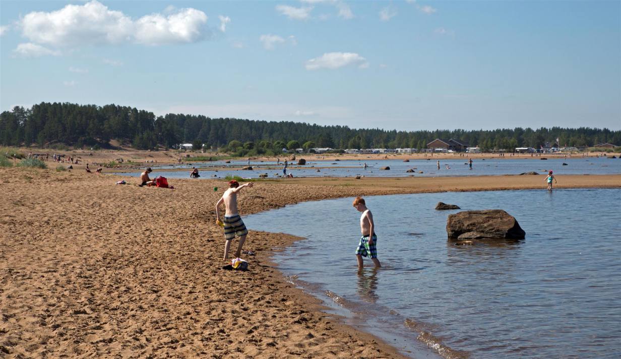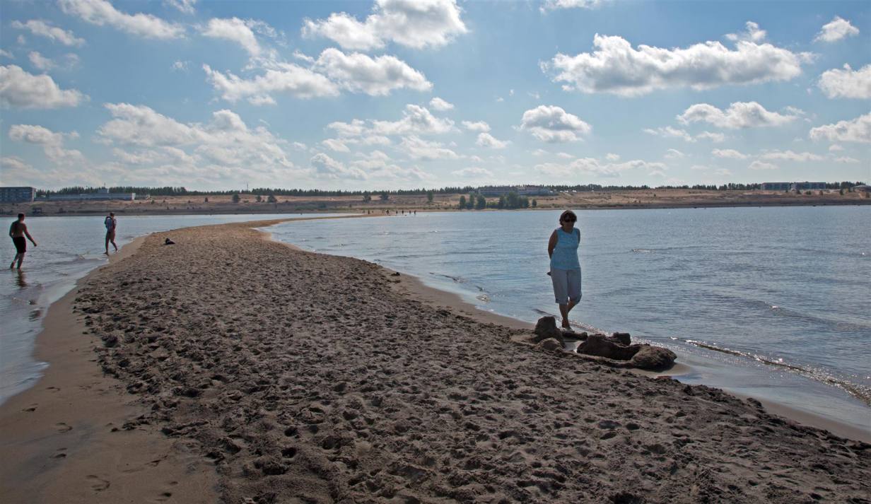 In Liminka wurden wir durch eine Tafel auf ein Naturreservat aufmerksam. Also kurz abbiegen und parkieren. Zu Fuss liefen wir einen Weg Richtung Meer. Am Ende des Weges gab es eine Beobachtungsstation für Vögel. Man konnte weit sehen, da es sehr flaches Land war, im Meer waren gar einige kleine Inseln auszumachen. Vögel habe ich nicht gesehen, dafür drei Entenfamilien. Es ist jetzt natürlich auch nicht Zeit der Vogelwanderungen. Weiter führte unsere Reise nach Raahe. Wir machten einen kurzen Spaziergang durch einen Teil der Stadt der noch alte Häuser hat. Es wurden auch neue gebaut, aber im gleichen Stil wie die bestehenden. Nach dem kurzen Halt ging es weiter. Nach weiteren 60 km erreichten wir Kalajoki. Dies ist die Sommerurlauber Hochburg von Finnland. Hiekkassärkät, die Sanddünen von Kalajoki, die nördlichsten der Welt sagt man. Es erinnert einem etwas an Italien. Ein unübersichtliches Konglomerat von Urlaubindustrie hat sich in den letzten Jahren breit gemacht. Ferienhäuser, Hotels, Spassbad alla Alpamare, Animationen für jeden Geschmack und natürlich ein Meer mit einem unendlichen Sandstrand. Wir stehen auf einem Campingplatz mit vier Sternen und 1200 Stellplätzen. Wir haben uns installiert und sind ein wenig die Umgebung erkunden gegangen. Kaum eine halbe Stunde später kam ein heftiges Gewitter, dass rund eine Stunde andauerte und den ganzen Platz unter Wasser setzte. Es hat überall grosse Pfützen. Als der Spuk vorbei war, war auch die Temperatur wieder normal bei 20 °C. Nach dem selbstgemachten Abendessen gab es noch einen kurzen Spaziergang, ehe es bereits wieder Mitternacht aber immer noch hell ist.