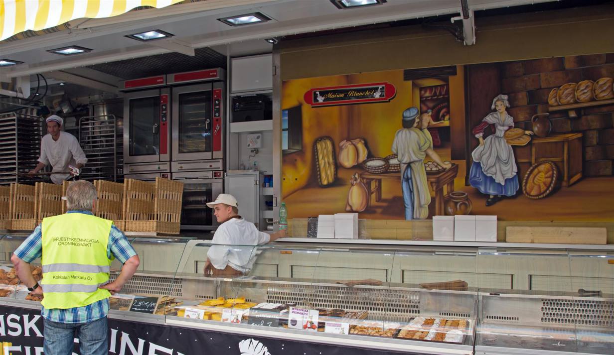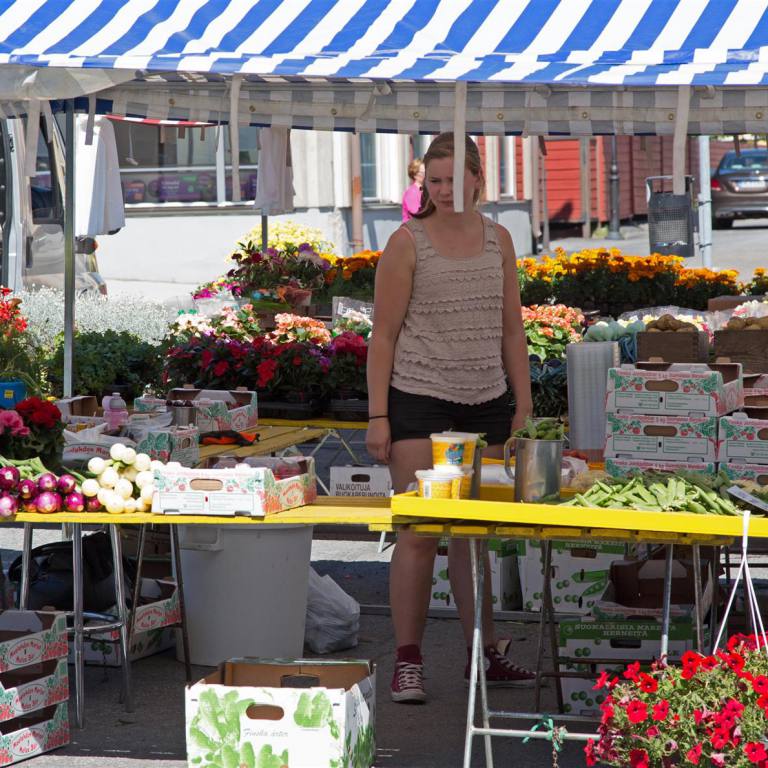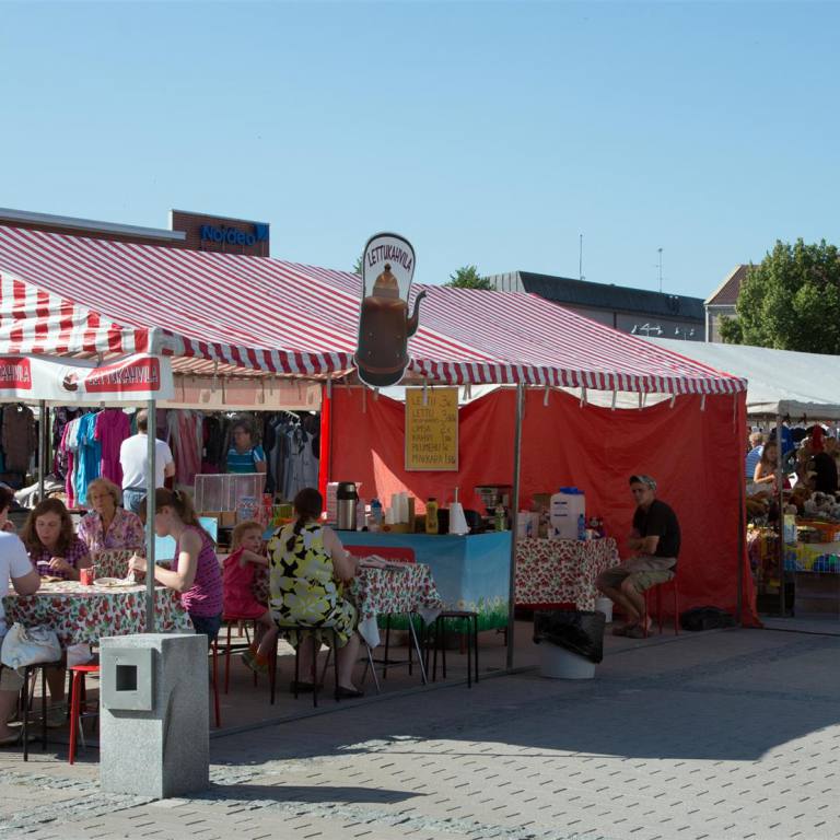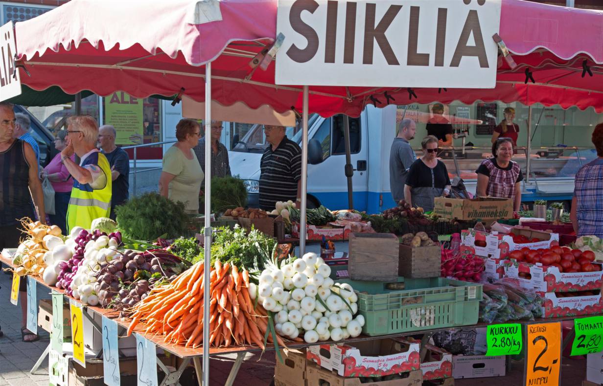 Es scheint heute wieder ein heisser Tag zu werden. Wir standen ziemlich früh auf und benutzen die Kühle den Markt in Kaankanpää zu besuchen. Jeden Donnerstag ist Markt auf dem Hauptplatz. Die ganze Umgebung trifft sich aber auch zu einem Schwatz. Dies kann man in mehreren Freiluftkaffes durchführen. Es gibt natürlich frischen Fisch, wenn gewünscht an Ort geräuchert. Gemüse und Beeren direkt vom Bauern und verschiedene Stände mit Textilien. Es wurde aber sehr heiss, sodass wir nach dem Besuch eines Kaffees schnell wieder ins Ferienhaus zurück fuhren.