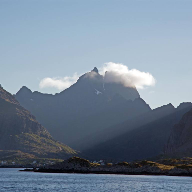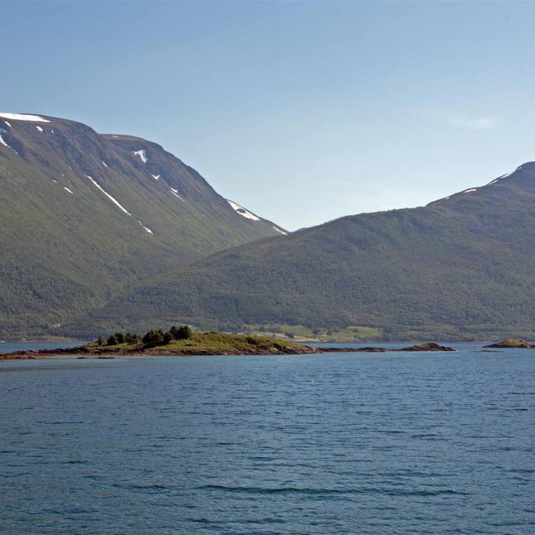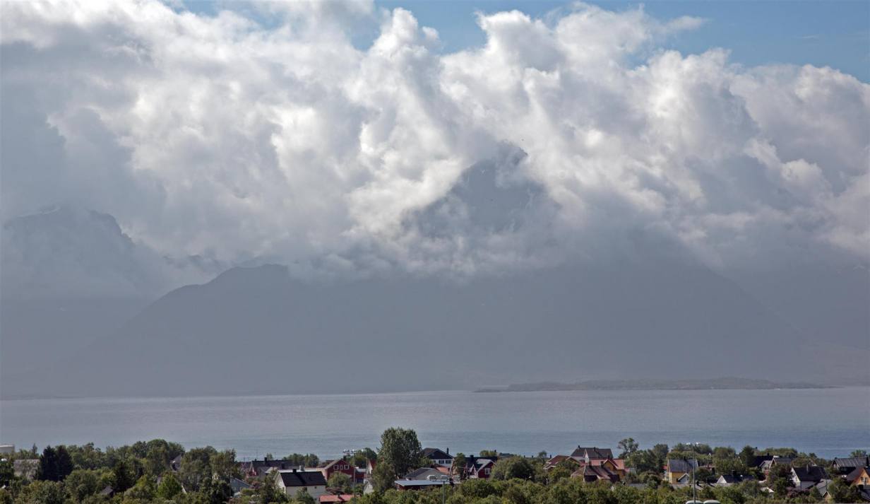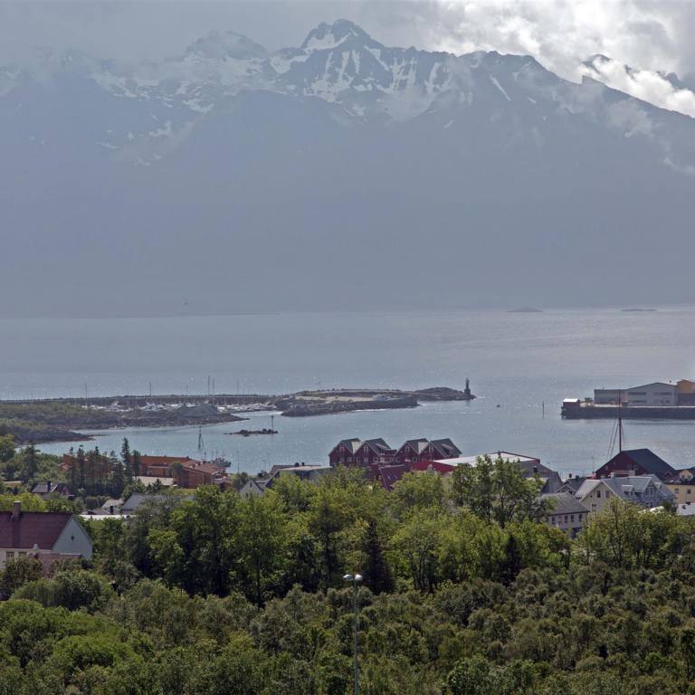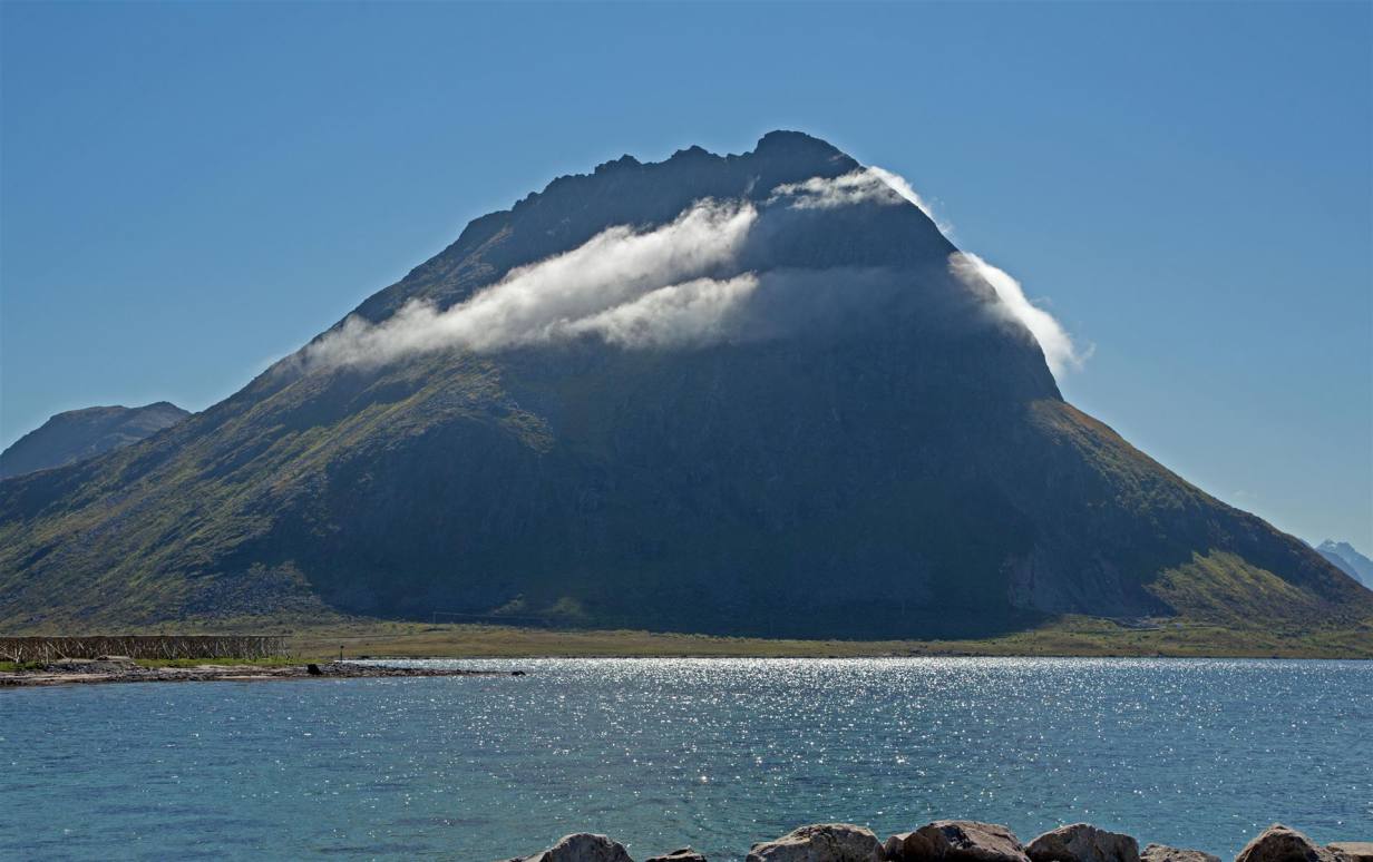 Nachdem es in der Nacht einmal kurz leicht geregnet hat war am Morgen rund herum alles wie mit Nebel verhangen. Wir haben gut geschlafen obwohl die Fähre und die Fischboote in der Nacht 200 m von uns entfernt in den Hafen einliefen. Das Motorengeräusch haben wir nicht mehr gehört. Von Westen her wurde es immer heller und die Wolken verzogen sich. Sehr schnell lichtete sich die Wolkendecke und die Sonne kam heraus. Wir blieben noch in Melbu und spazierten den Hang hinauf wo wir eine wunderbare Rundsicht genossen. Nach einem guten Stück Kuchen und Kaffee fuhren wir gegen Stockmarkes weiter.