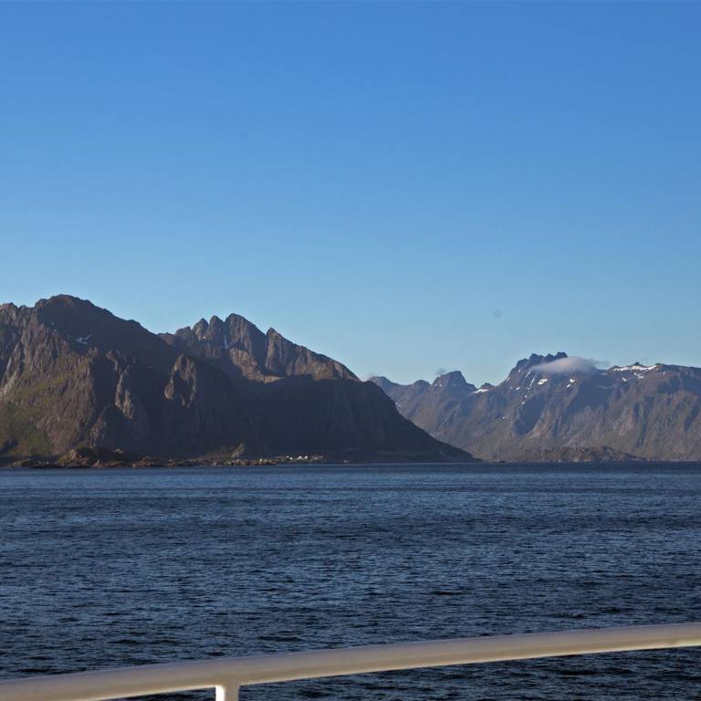 Noch 35 km bis Bodö. Wir fuhren die 12 km zurück und bogen wieder gegen auf E6 ein Richtung Bodö. Das Schiff um 15.00 Uhr konnten wir nicht mehr erreichen. Um 17.45 Uhr ging aber bereits das folgende was bei weitem nicht ausgebucht war. Es war eine schöne saubere mittelgrosse Fähre die uns in rund drei Stunden auf die Lofoten brachte. Auf der Fähre konnte ich die Zeit mit dem Fussballspiel Schweiz gegen Argentinien verkürzen. Die Kulisse der Inselgruppe die schon von weitem sichtbar war habe ich aber trotzdem genossen. So ging die Zeit schnell vorbei. Nach dem Verlassen des Schiffe steuerten wir sofort den Campingplatz neben der Schiffsanlegestelle an. Mit einem wunderbaren Blick Richtung Meer genossen wir den Rest des Abends.