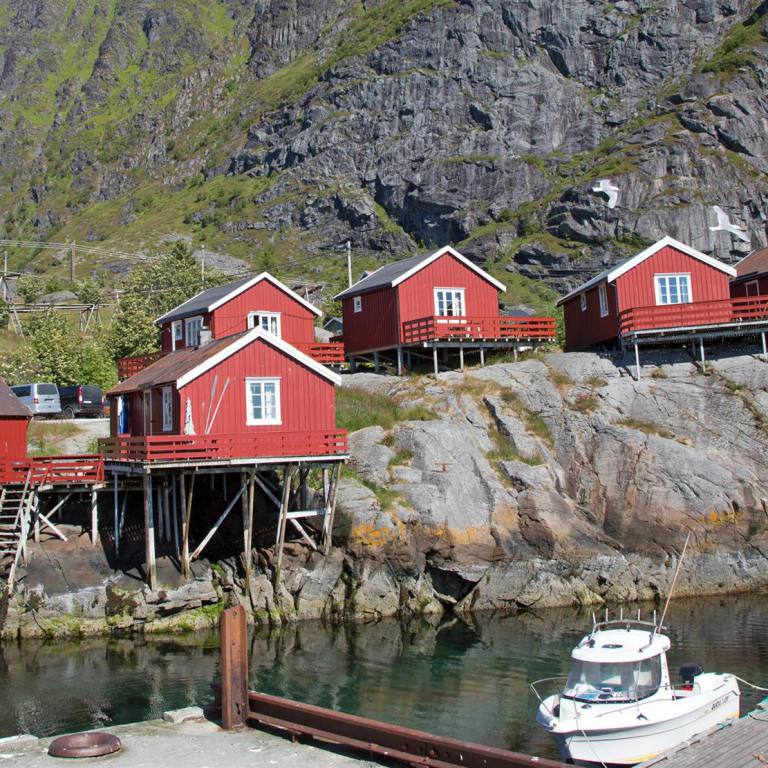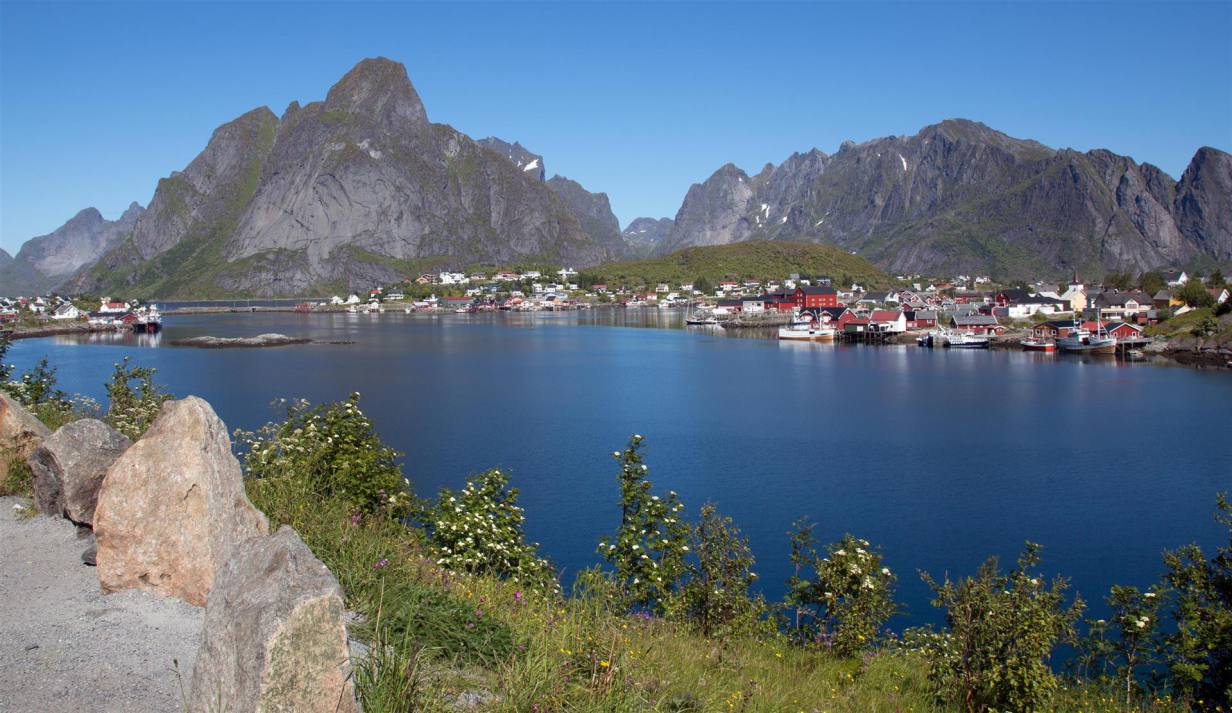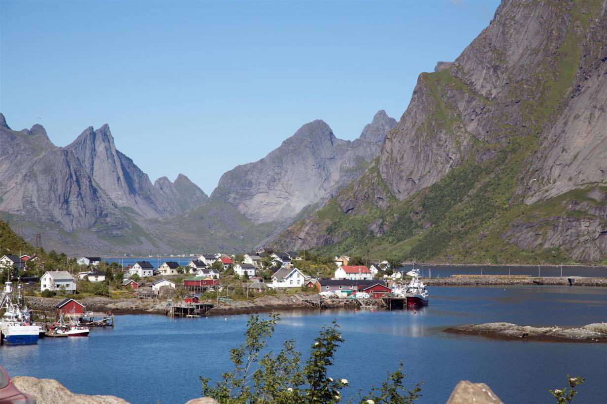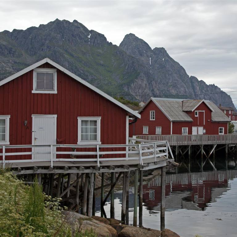 Der Morgen war wieder wunderschön und bereits um 09.00 Uhr warm. Wir fuhren die 9 km wieder zurück auf die E 10. Nach wenigen Kilometern in Borg kam das berühmte Lofotr Wikingermuseum. Wie sich herausstellte war es gut besucht waren doch schon viele Wohnmobile und Autobusse auf dem Parkplatz versammelt. Trotzdem man merkte die vielen Leute nicht da die ganze Ausstellung auf einem grossen Gelände angesiedelt war. Man sieht einen schiffsähnlichen Bau bereits von der Strasse aus. Wenige Meter daneben ist die Wegkirche angesiedelt. 1983 brannte die alte Kirche, darauf wurde eine neue Mehrzweckkirche gebaut. Die Wegkirche hat ca. 10‘000 Besucher im Jahr und soll eine offene Kirche sein. Als Mehrzweckkirche hat sie Räumlichkeiten für eine vielseitige Nutzung. Es sind dies eine Gemeindesaal, ein viel genutztes Kaminzimmer, eine Küche und „man höre“ drei grosse Bombenzimmer im Keller. Auf die Instrumente und den Klang in der Kirche ist die Gemeinde besonders stolz. Die Orgel ist eine Ryde und Berg Orgel mit 18 Register die 1989 fertig wurde. Wegen der hervorragenden Akustik werden viele Konzerte in der Kirch gegeben. Es wurde gar gesagt, dass die Kirche der beste Konzertsaal Norwegens sei. Ein Paar Meter wieder zurück zum Museum und auf dem grossen Parkplatz das Fahrzeug abstellen. Bei der Ticketausgabe wurde man eingeführt in die Technik die man mitbekam. Ohrhörer und eine Stift wie eine Taschenlampe mit Knopf wurden benötigt, damit man die Beschreibungen in den verschiedenen Sprachen hören kann. An jeden Objekt hat es einen Sensor, der mit dem eigenen per Knopfdruck aktiviert wird, dann hört man die interessanten Erklärungen. Dazwischen wird noch ein Film gezeigt über die Wikinger mit Happy End. Wenn man aus dem Gebäude geht und etwas nach oben lauft sieht man ein grosses Schiffsartiges langes Gebäude. Mit 83m Länge ist es der grösste, jemals ausgegrabene und rekonstruierte Häuptlingshof. Im Wohnbereich kann man den Wikingern bei der Arbeit zu schauen. Zu guter letzte macht man noch einen 1.3 km langen Fussmarsch zum Fjord, wo ein rekonstruiertes Wikingerboot steht, mit dem man gemeinsam mit anderen Leute eine Runde rudern darf. Ich habe vom Ufer aus zugeschaut wie lange es dauerte bis die ganzen Ruderer synchron in die gleiche Richtung ruderten. Jedenfalls erreichten sie nach einer halben Stunde wieder den Heimathafen. Unser nächstes Ziel war dann Henningsvaer ein Fischerdorf