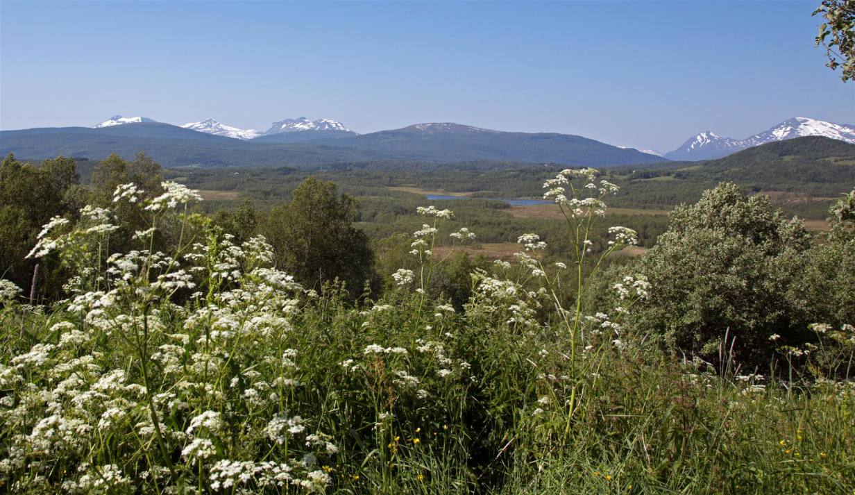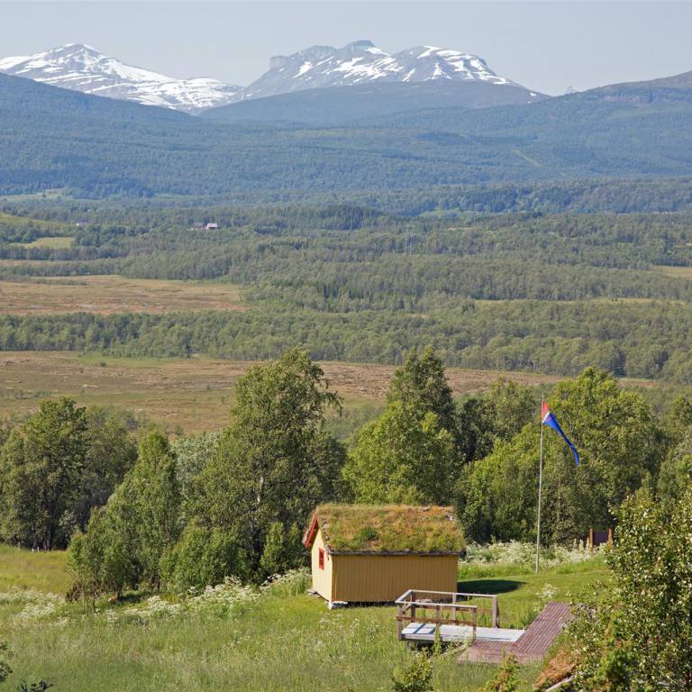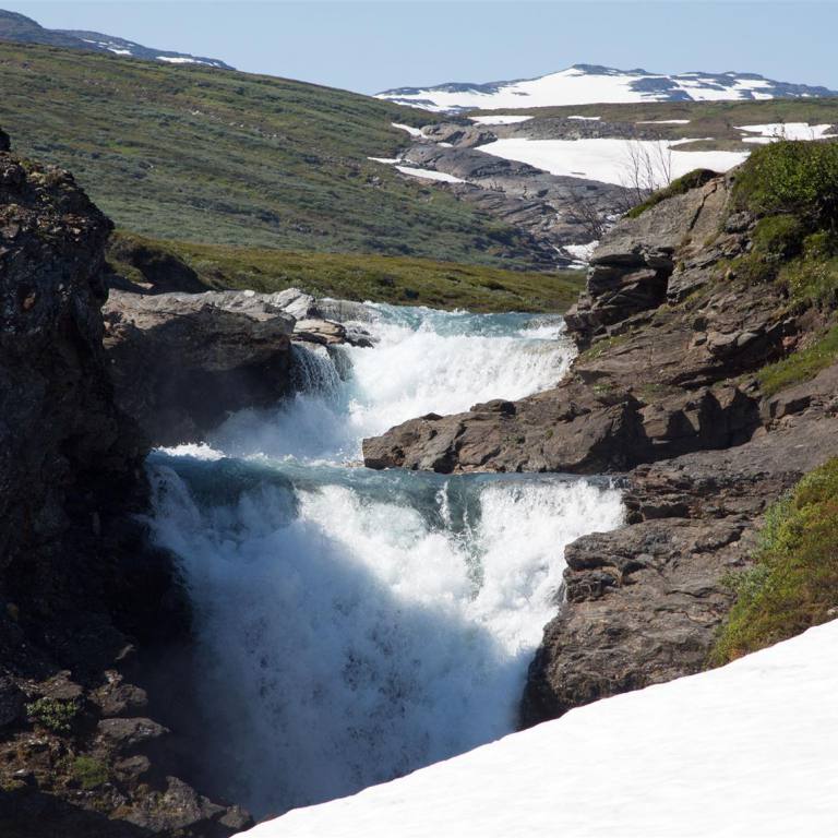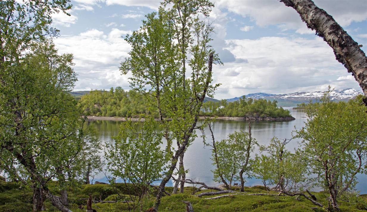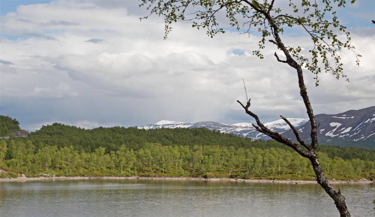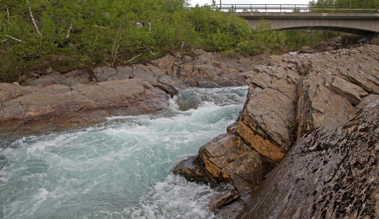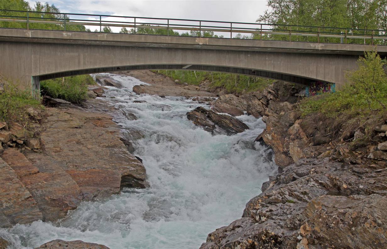 Nachdem wir wieder zurück im Wohnmobil waren, fuhren wir weiter in die Stadt. Es handelt sich um ein Skizentrum. Die ganzen Läden und Lifte waren aber ausser Betrieb oder geschlossen. Also zogen wir weiter nach Hemavan. Dies ist ebenfalls ein Skiort, der aber noch etwas belebter war. In einem Restaurant haben wir den Lunch genommen und sind dann den Berg hinauf gefahren zu einer Sehenswürdigkeit. Das Naturum ist eine erlebnisreiche Ausstellung über die schier unendlichen Weiten des hier angrenzenden Vindelfiäll eines der grössten Naturreservate Europas. Ebenfalls an dieser Stelle ist der Fjällbotanische Garten den nördlichsten der Welt. Im goldenen Turm ist ein anscheinend hervorragend gutes Samisches Restaurant. Leider konnten wir es nicht testen, da es natürlich geschlossen war. Wir mussten demzufolge zu Fuss durch den gut sortierten und markierten Garten zum Orchideensumpf. Aber auch hier war noch nicht viel zusehen. Wir ware rund drei Wochen zu früh vor Ort. Die Blumen waren noch nicht gespriessen, man sah nur die grünen Stengel. Die Aussicht von da oben rundherum auf die Berge und Seen war aber atemberaubend. Wir nahmen den Rückweg über die Skiliftstation zum Wohnmobil. Nun ging es weiter. Ein weiterer kurzer Halt ca. 3 km weiter. Ein Wildwasser unterquerte die Strasse. Blaues lupenreines Wasser kam von den Bergen und floss in den See. Nach weiteren rund 50 Kilometern machten wir nochmals einen kurzen Halt und spazierten rund 2 km über zwei Brücken, Wurzelpfaden und Klein-Birken-Wald dem Ufer des Gausjosjo entlang Richtung Samilager wo verschiedene Spuren von 1000 – 6000 Jahre alter Besiedlung entdeckt wurden. Der weg war uns ab er zu lag, sodass wir vorher umdrehten. Was uns nun erwartete ist unbeschreiblich. Wunderschöne Landschaften mit Seen, Wasserfällen und Bergen begleiten uns auf dem Weg nach Mo i Rama. Die Eindrücke kann man nicht beschreiben. Desshalb lasse ich einige Bilder dafür sprechen. Am Ende ging es rund 500 Meter abwärts auf Meereshöhe nach Mo i Rana.