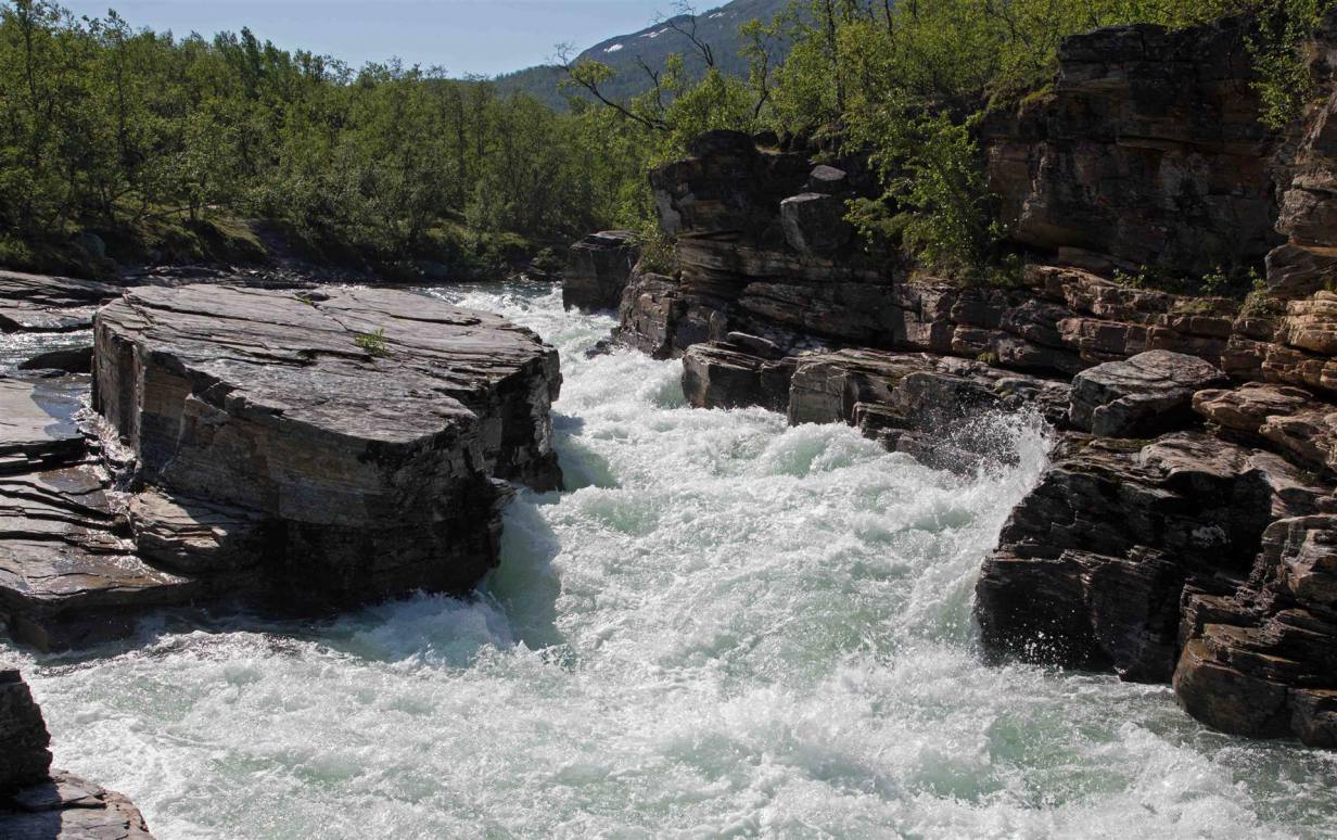 In der Stadt Storuman war ein dreitägiges Fest mit vielen Ständen wo man Essen aus verschiedener Länder kaufen konnte. Weiter gab es noch Stände mit Kleidern, viel Ramsch usw. Ein kurzer Abstecher auf den nahen Berg war eine weitere Augenweide. Die Aussicht war grandios. Von einem Aussichtsturm sah man kilometerweit Wasser und Wälder. Storuman hat am See einen schönen Campingplatz der recht gut belegt war. Aus Gründen der Nachtruhe, am Abend war hinter dem Platz Tanz angesagt, zogen wir weiter. Wir zogen nun auf der E12 Richtung Mo i Rama (N). Was nun kam übertraf alle bisherigen Strecken. Wir fuhren die ganze Zeit entweder einem Fluss oder See nach. Traumhafte Landschaften bei idealen Lichtbedingungen (Sonnenschein) wechselten sich mit Bergen und Wäldern ab. So kurzweilig war noch keine Strecke. Dazwischen mussten wir immer wieder anhalten um die wilden Flüsse und Stromschnellen zu bewundern. Gegen 20.00 Uhr trafen wir in Tärnaby ein. Wir sind nun auf einem schönen Campingplatz an einem wilden Fluss, der direkt in den See läuft.