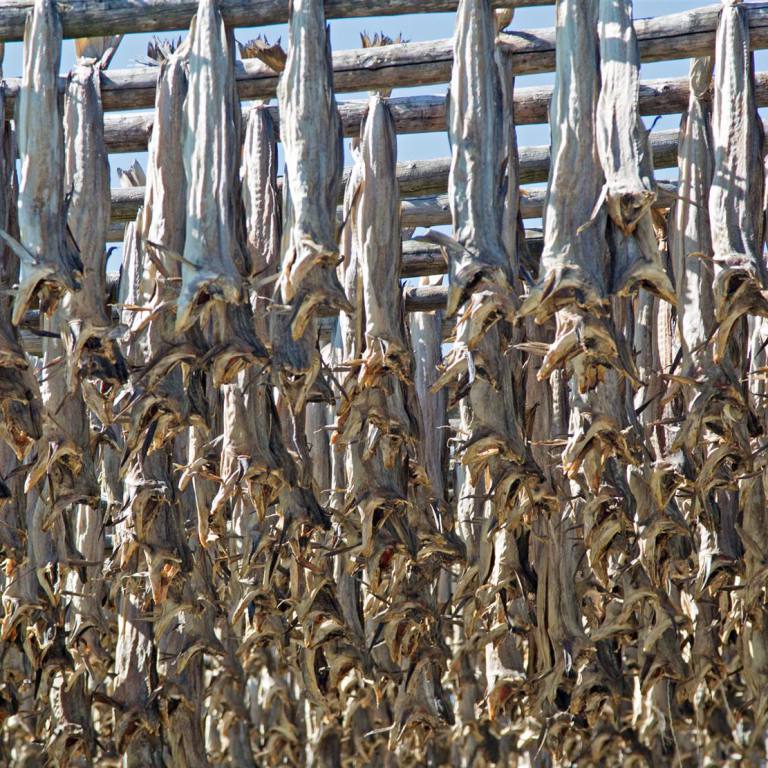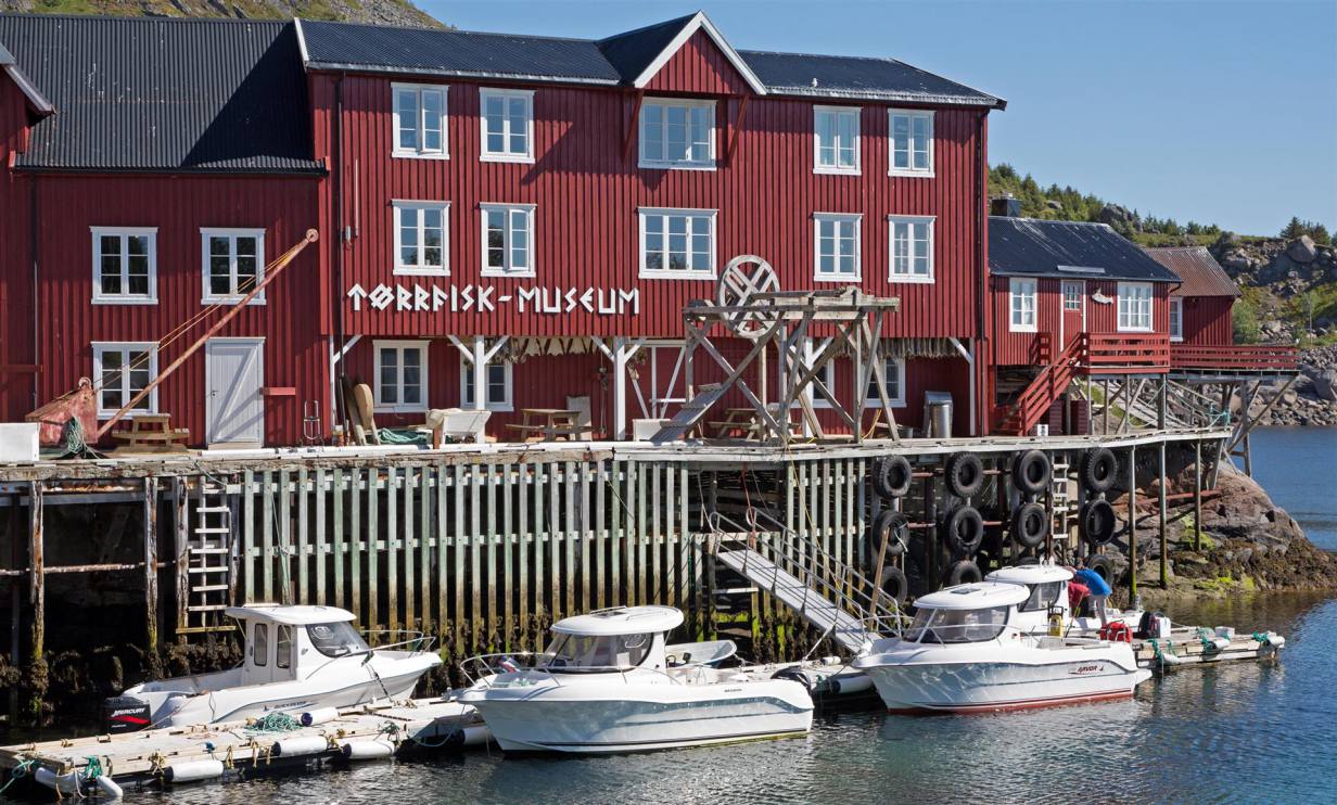 Ich kann mir nicht erklären wie wir das verdient haben, aber heute ist bereits wieder wunderschönes und dazu noch warmes Sommerwetter. Nun sind wir endgültig auf der Lofoten Inseln (übersetzt Luchsfüsse) angekommen. Das war heute ein riesiges Erlebnis. Wir fuhren am Morgen zuerst Richtung Süden, was wir schon lange nicht mehr gemacht haben. Unser Ziel war die Ortschaft an der Südspitze der Insel Moskenesoya mit dem kürzest möglichen Namen A. Die Strasse führte uns entlang des Felsens auf schmalen Strassen zum Dorf. Es ist eine der wenigen alten Handelsorte der Lofoten, der in seiner ursprünglichen Form erhalten blieb. Die Ausstellungen des Museum verteilen sich auf mehrere nahe beieinanderliegende historische Gebäude im Ort. Wer noch in den Kinderjahren Tran zu essen bekam konnte in einem Gebäude die Tranherstellung in Bildern und Gegenständen sehen. Man konnte auch Tran dass sehr viele Vitamine enthält dort kaufen. Im Lofoten Torrfiskmuseum, dem Trockenfisch Museum das einzigartig auf der Welt ist wird man in seiner eigenen Sprachen empfangen. Der Leiter des Museums spricht viele Sprachen. Ich konnte hören wie er mit sechs verschiedenen Sprachen die Besucher begrüsste und sich auch mit ihnen unterhielt. Hier kann man alles über die Herstellung den Verkauf des Trockenfisches informieren. Das ist Norwegens ältester Exportartikel. Man kann sehen mit welchen Gerätschaften und mit welchen Methoden Salzfisch, Klippfisch, Stockfisch in bester Qualität hergestellt wird. Man sieht wie man zwei und zwei zusammenbindet wozu die getrocknet bizarr wirkenden Dorschköpfe verwendet werden. Ein weiterer Spaziergang führte uns an das Ende der Insel wo man die beiden Nachbars-und Vogelinseln Vaeroy und Rost im offenen Atlantik sehen kann. Nach dem obligaten Kaffee und Kuchen in einer urtümlichen Bäckerei frisch ab Backofen ging es wieder zurück bis zu unserem Ausgangsort und von da an wieder Richtung Norden.