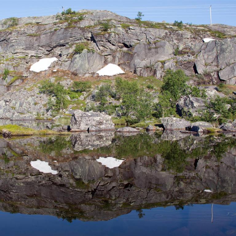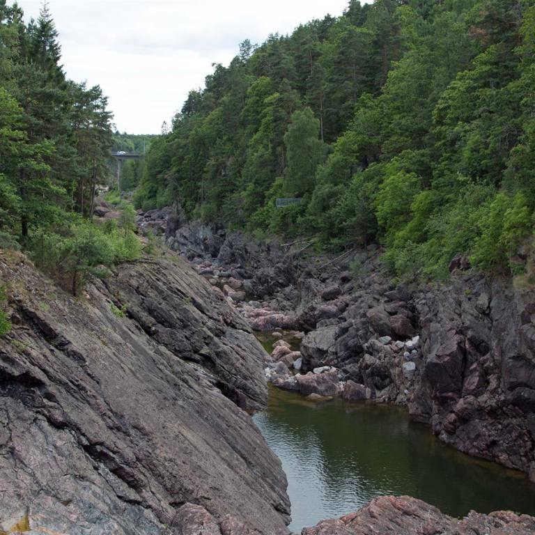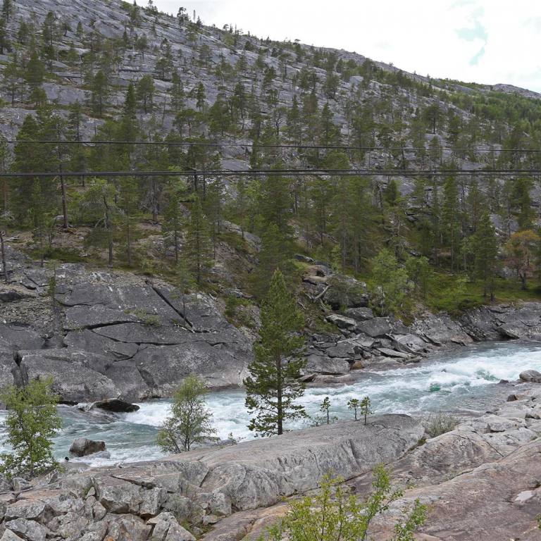 Eine wunderschöne Strecke durch das waldreiche Dunderlandsdalen immer dem Fluss Ranelva entlang. Eigentlich würde man gern am Fluss rasten aber es gibt keine Möglichkeiten. Wir verlassen das Dunderlandstal ziehen in Schleifen bergan, immer noch begleitet uns der Ranelva. Von Kilometer zu Kilometer wandelt er sich vom breitströmenden ruhigen Fluss in einen über Klippen und Felsklötze hinabstürzenden schäumenden und brausenden Strom. Das nächste grosse Ereignis steht uns noch bevor. Wir machen vor der Passstrasse noch kurzen Halt für Kaffee und Kuchen. Wir steigen nun auf knapp 700 m ü Meer. Ist eigentlich nicht viel wenn man an die Schweiz denkt. Hier wird aber schnell ersichtlich, dass die Bäume immer kleiner werden. Es gibt nur noch die kleinen verkrüppelten Birken. Später verschwinden auch diese. Dass im Winter hier oben extreme Bedingungen herrschen sieht man an den hölzernen Garagen die man über die Schienen gebaut hat. In ihnen kann man ganze Züge abstellen, wenn Schneestürme die Weiterfahrt unmöglich machen
