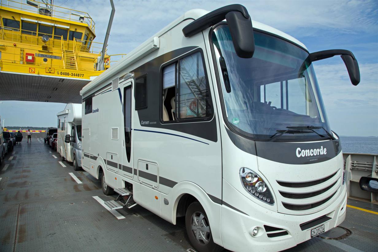 Nun fuhr ich weiter Südwärts über Uusikaupunki, das einen schönen Hafen hat. Auf Nebenstrassen gings dann nach Taivassalo und nun begann meine klimatisierte Reise durch das Archipel von Turku. Es gibt einen Weg, der führt über ein Archipel von vielen Inseln nach Turku. Von Taivassalo aus geht es durch Wald und Felder und dann über eine schöne Bogenbrücke und über Dämme durch das Schärengebiet. Dann kommt die erste Fähre. Ich musste rund anderthalb Stunden warten. Zum Glück stand ich im Schatten und es wehte wie immer am Meer eine angenehme Brise. 25 Minuten Gratisfähre bis nach Kannvik. Nun gings Schlag auf Schlag. Nach wenigen Kilometern eine kurze 5 Minuten Fähre ohne warten drauf und los und so ging es weiter. Von Dalen nach Mossala. Dies ist die einzige Fähre die bezahlt werden muss, alles andere sind Fähren die die unterbrochene Fahrbahn (durch Wasser) ersetzen und vom Staat bezahlt werden. Sie dauerte dreiviertel Stunden. Es ging nahtlos weiter. Ich quere die Insel über die asphaltierte Schlängelstrasse. Eine weitere Fähre bringt mich von Mossola nach Björko in fünf Minuten. Es folgen 8 km auf schmaler Strasse durch Wald und Felder und schon wieder eine Fähre zwischen den Orten Träsk und Roslax. Eine gestoppte Minute dauerte die Überfahrt. Nach weiteren 15 km Fahrt auf interessanten Wegen, die auf und nieder gehen, kurvenreich sind und immer wieder Blicke aufs Meer zulassen erreichen ich eine weitere diesmal grosse Fähre, die mich von Kittuis nach Galtby bringt. Rund 40 Minuten dauert die Reise und quert die Route der grossen Ostseefähren von und nach Turku. Einige Kilometer weiter habe ich einen edlen Campingplatz in Nagu gefunden. Edel ? Nur der Preis, aber schön gelegen. Ich habe also heute den grossen Teil der Reise im klimatisierten Wohnmobil oder auf dem Meer verbracht wo immer ein schöner Wind die Wärme vergessen lässt. Auf meiner Etappe habe ich auch gesehen, dass sogar Hunde mechanisch gekühlt werden mussten. So lässt sich 31 °C ertragen. Ich habe heute sechs Fähren benutzt, bis auf die erste Passage nie mehr als 2 Minuten gewartet und bin nun in Nagu, von wo aus ich Morgen nur noch eine Fähre nehme und nachher wieder auf dem Festland bin. Ein wunderbares Erlebnis bei idealen Wetterbedingungen. Meer und Inseln soweit das Auge reicht.