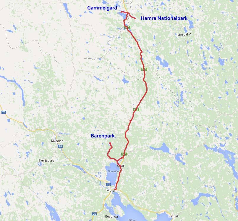 Nach den individuellen Beschäftigungen am Morgen trafen wir uns wieder zum Mittagsessen in der Stadt Mora. Wie schon gewohnt suchten wir eine Lokal mit Dagens Rätt. Gegen ein Uhr verliessen wir die Stadt Nordwärts. Unser nächstes Ziel sollte der Bärenpark etwa 30 km von Mora entfernt sein. Über kleine schlechte Strassen ging es langsam den Berg hinauf. Wir kamen von Orsa nach Grönklitt. Das größte Touristenmagnet ist ein Bärenpark und eine Wintersportanlage mit zahlreichen Abfahrtshängen. Der Bärenpark ist ein eingezäuntes Gelände, in dem außer verschiedenen Bären noch andere Raubtiere wie Wölfe, Luchse, Vielfraße, Tiger und Leoparde untergebracht sind. Auch in den umliegenden Wäldern sind einige dieser Tiere heimisch. Der berühmteste "Einwohner" ist Wildbär, das in der Stuttgarter Wilhelma geborene junge Eisbärmännchen, das am 15. Mai 2009 in die Polar World umgesiedelt wurde. Eine Ausstellung zu den Tieren und auch zum Klima in den Polarregionen (Erderwärmung) runden das Programm ab. Ein lohnenswerter wenn auch teurer Ausflug. (Eintritt rund 30 Fr ). Nun ging es wieder zurück nach Orsa und dann wieder gegen Norden. Immer wieder sieht man unterwegs bewaldete Berge. Kurz vor Sveg kann man sich entscheiden zuerst nach links zu fahren nach Fägelsjö um dort den Gammelgard ein sehenswertes Dorfensemble mit alten Holzhäusern zu besuchen. Nach einem Kaffee Halt mit gutem Kuchen ging es 5 km zurück über die Hauptstrasse und wieder 5 km zum Hamra Nationalpark. Absolut ruhig ohne auch nur das geringste Geräusch werden wir hier übernachten.