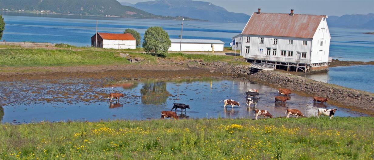 Über Nacht ist es Sommer geworden. Wir haben so unglaublich das tönt eine Tropennacht verbracht. Ich habe geschwitzt und nicht gewusst warum. Als wir frühstückten war es bereits 24 °C. Leider mussten wir unseren schönsten Platz der Lofotenreise verlassen. Unser neues Ziel sollte Narvik sein, aber es kam anders. Zuerst der Reihe nach. Wir mussten zuerst wieder rund 15 km zurück fahren bis zur B820. Es war eine Stichstrasse nach Sto. Unterwegs traute ich meinen Augen nicht, als ich Kühe in einem Fjord stehen sah