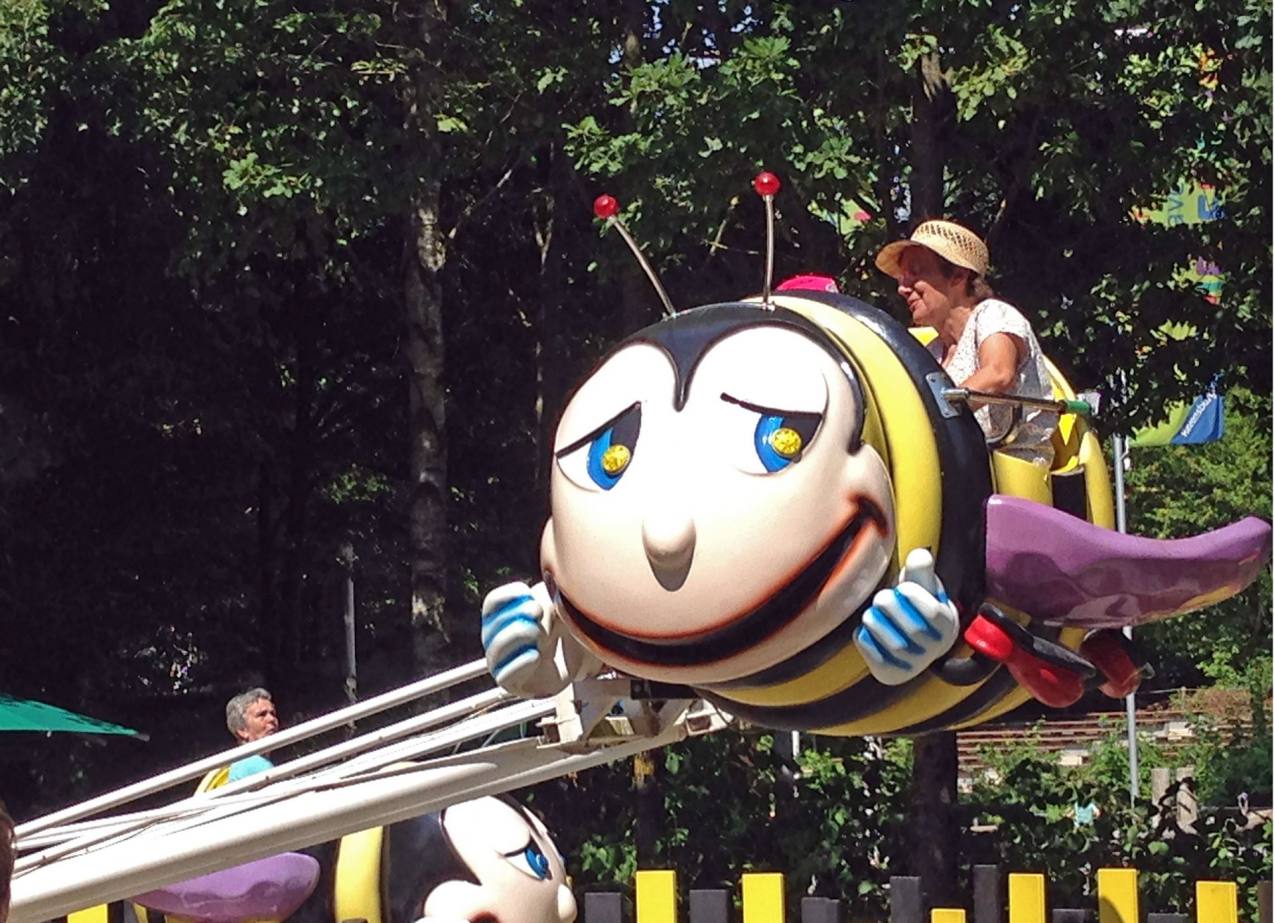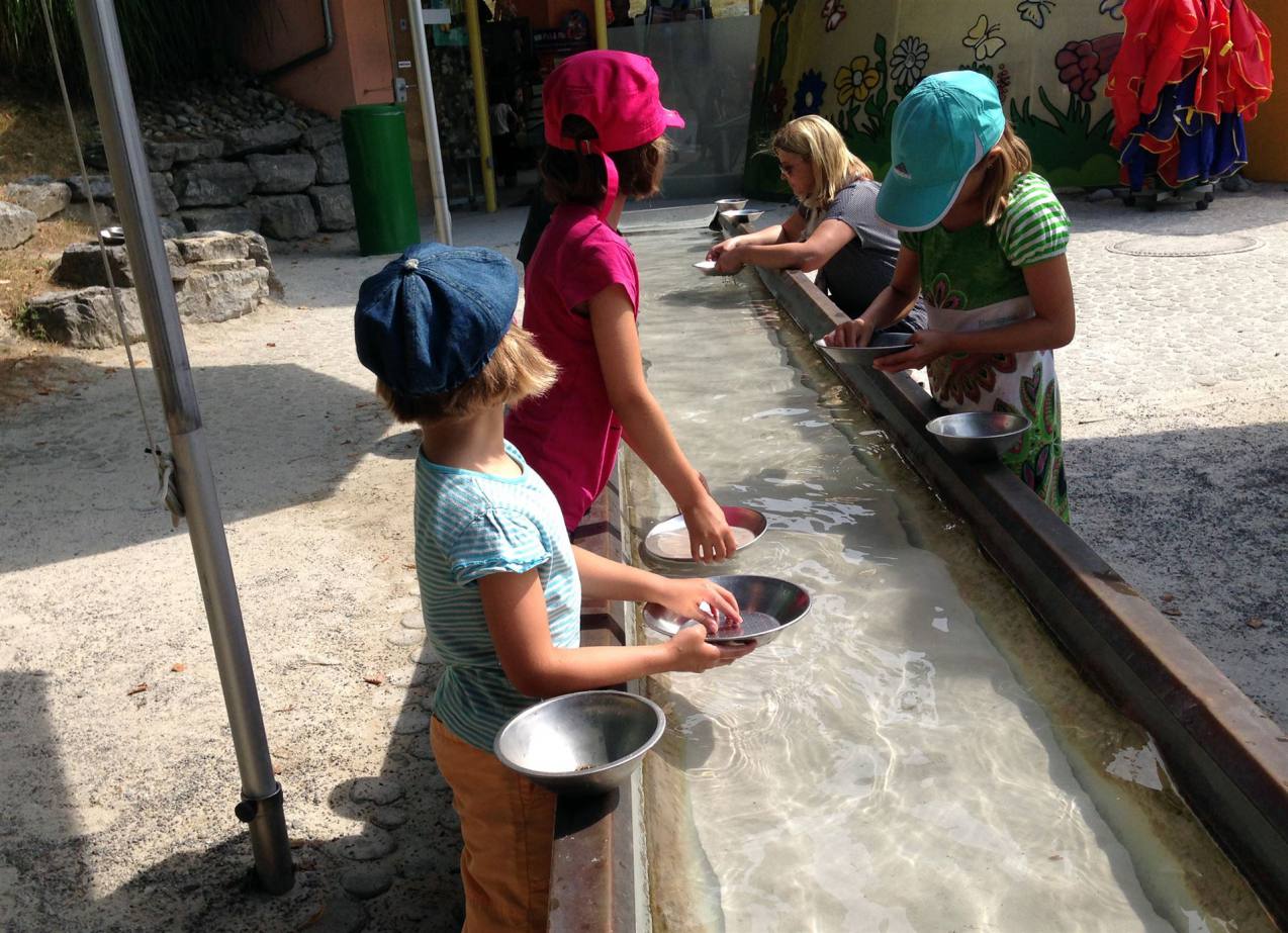 Pünktlich liefen wir zum Haupteingang und zeigten unsere Einlasskarten. Langsam ging es von Anlage zu Anlage. Immer wieder warteten wir bis sie an den Spielgeräten oder an den Spielen fertig waren. Die Temperaturen stiegen langsam, aber glücklicherweise hatte es immer wieder Schattenplätze. Sogar Tuulia war mit Elina auf der Biene unterwegs. An der ersten Station wurde Gold geschürft. Die Kinder waren kaum mehr wegzubekommen. Die Ausbeute fiel reichlich aus.