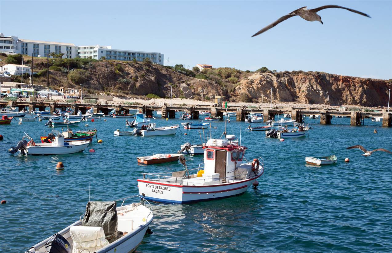Während die Familie sich noch kurz am Strand vergnügte zog Tuulia und ich weiter. In Sagres sahen wir plötzlich weit unten einen Fischerhafen. Wir fuhren die rund 70 Höhenmeter ans Meer hinunter und sahen eine grandiose Kulisse von Fischerbooten und tausenden von Möwen.
