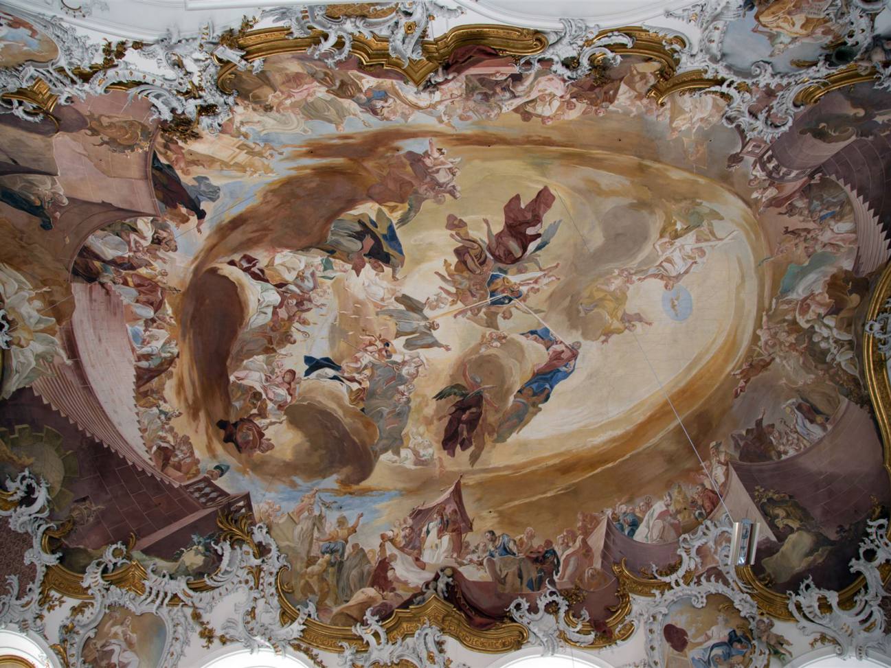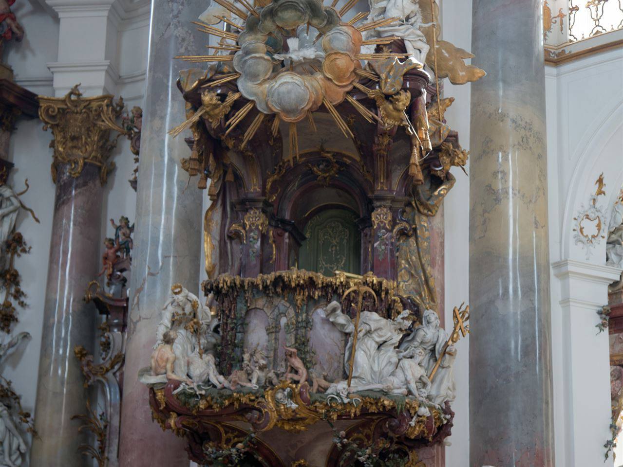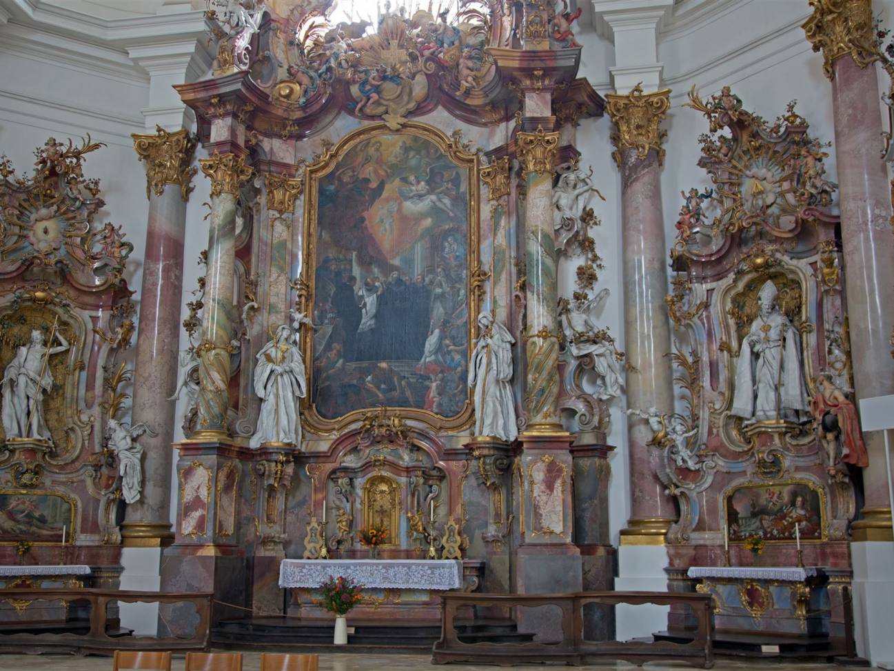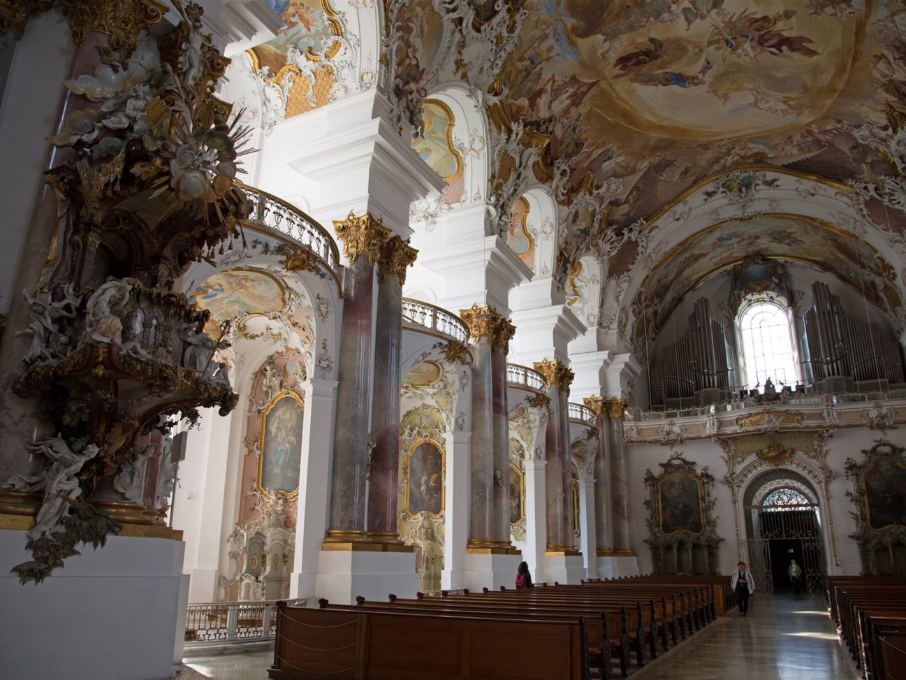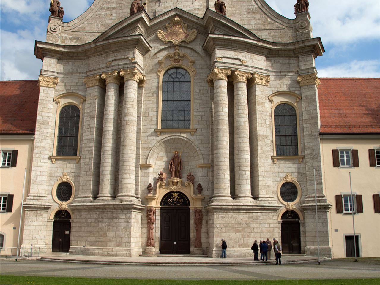 Mittelpunkt des alten Kloster- und Wallfahrtsortes ist das Münster , eines der bedeutendsten Bauwerke des Spätbarocks. Es stammt aus den Jahren 1739-65. Er war bis 1803 Klosterkirche der Benediktinerabtei Zwiefalten , seit 1812 ist er Pfarr- und Wallfahrtskirche. Das Zwiefalter Münster ist einer der größten Kirchenräume Deutschlands. Der erste Eindruck ist überwältigend. Wenn man genau hinschaut, sieht man verschiedene interessante Details. Zum Beispiel der Beichtstuhl ist mit Palmen verziert. Die beiden Kanzeln sind mit vielen Figuren geschmückt. Viel Marmor und Gold ergänzen die Innereien des Münsters. Auch die Akustik ist hervorragend. Es finden viele Konzerte in der Kirche statt.